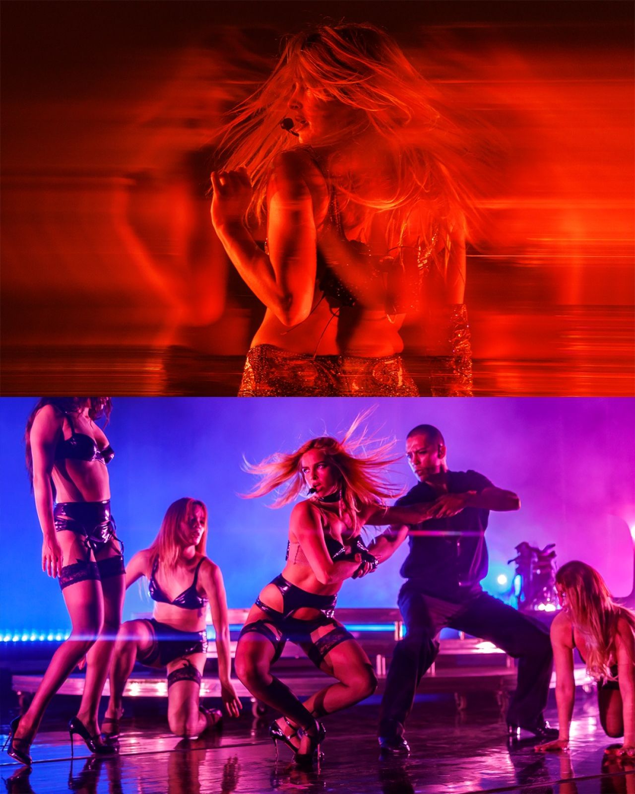 The heart of the onstage fashion is a custom, pale pink/nude mini dress. The silhouette is instantly recognizable as a dramatic tutu, featuring layers of voluminous, sheer tulle that flare out from the waist and extend into an elaborate, sweeping train. The bodice contrasts the light, airy skirt with heavy embellishment, appearing to be intricately covered in rhinestones and crystals that catch the stage lighting. This textural interplay—tulle fluidity versus crystal rigidity—is key to the look’s appeal. Her accessories are strategically used for an edgy vibe: she sports a single, brightly colored crocheted glove in vibrant purple on her microphone hand, an unexpected detail that adds a DIY, personalized feel. Completing the look are a pair of hot pink pointed-toe pumps, providing a sharp, saturated burst of color that grounds the otherwise ethereal garment.