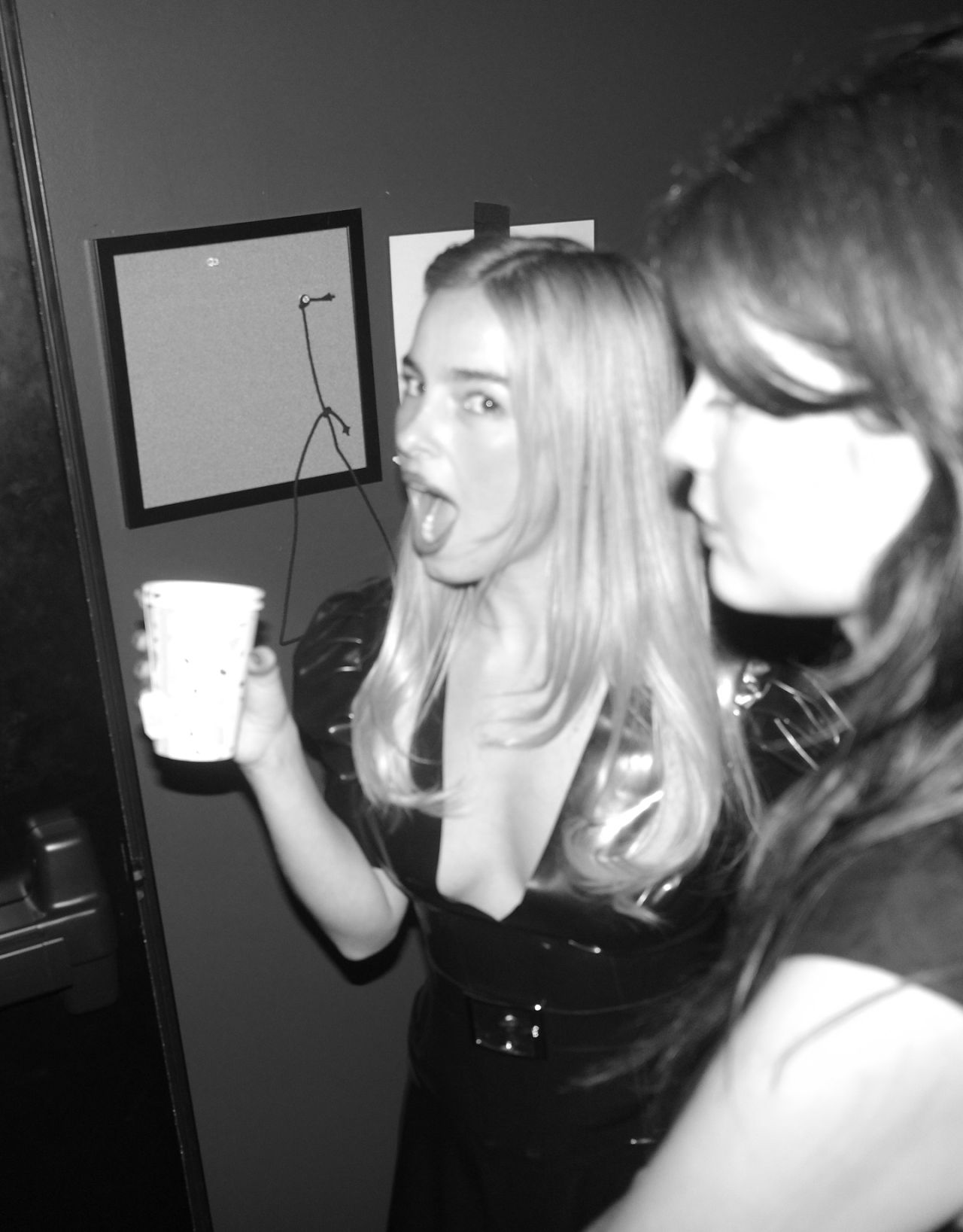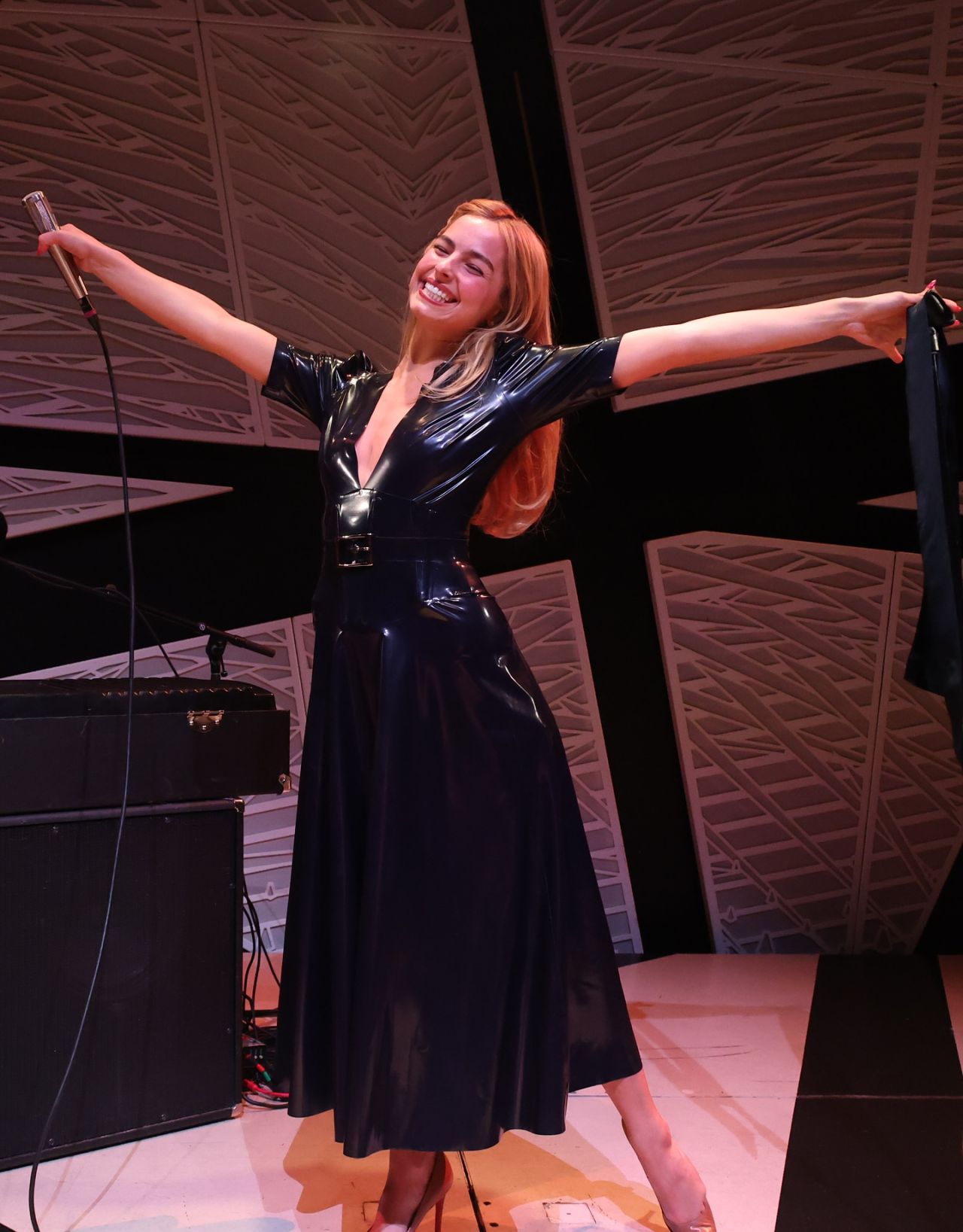 In the first visible image, Rae is seen in a performance-like setting, holding a microphone with her arms outstretched, a vision of confident stage presence. The glossy, light-reflecting finish of the latex is the outfit’s defining feature, immediately setting a tone of bold, uncompromising style. The look is grounded by neutral-toned high-heel pumps. In a second, more theatrical frame, the high-fashion edge is amplified; Rae wears the same latex garment partially hiked up to reveal high-waisted neutral stockings or garter straps, coupled with a black blindfold that shifts the mood from performance to high-concept styling, reminiscent of boundary-pushing celebrity photos in recent years.