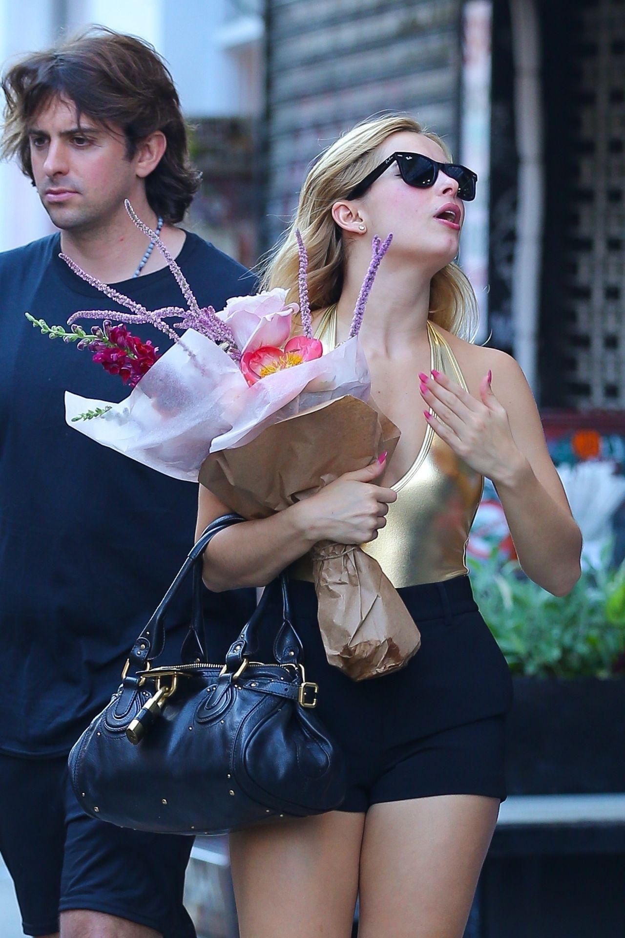 The centerpiece of the outfit is a shimmering metallic gold bodysuit featuring a plunging V-neck and a halter strap design. This dramatic garment is neatly contrasted by a pair of simple, high-waisted black shorts with a clean finish. The look is grounded by the footwear: gold pointed-toe mule heels that subtly echo the bodysuit’s metallic sheen. For accessories, the personality opts for oversized black sunglasses and carries a classic black leather shoulder bag with distinct hardware, along with a bouquet of flowers. The styling, overall, balances the dramatic glamour of the gold with the simplicity of the essential black pieces.