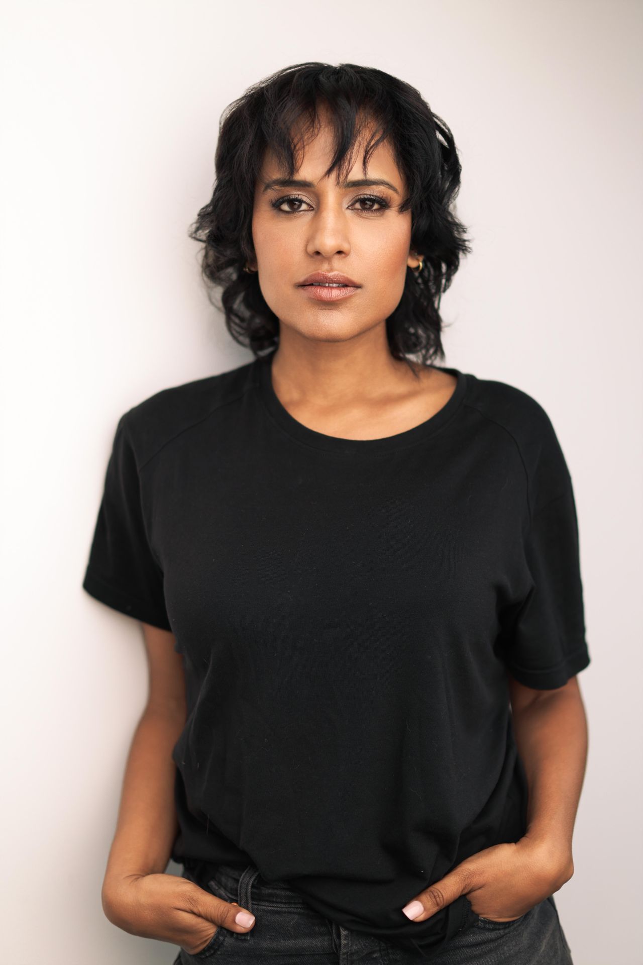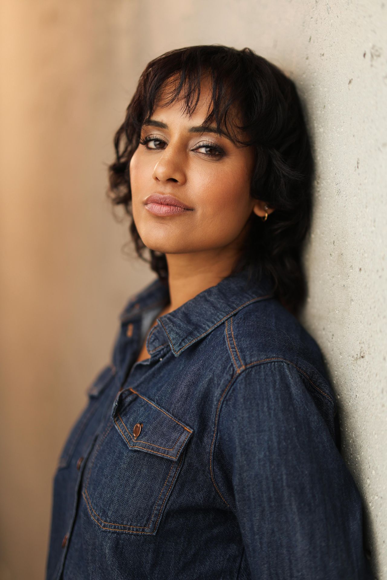 For a 2025 Photoshoot that emphasizes texture and subtle contrast, Agam Darshi opts for an effortless wardrobe piece: the denim shirt. Please note: This analysis is based solely on the visible portion of the outfit, as the image is cropped above the waist. The actress is seen in a deep indigo denim top, characterized by a classic collar and bold, buttoned chest pockets with contrast stitching, nodding to traditional utility and Western wear. This simple but effective garment provides a strong, textural foundation to the portrait, leaning against a neutral, warm concrete wall.