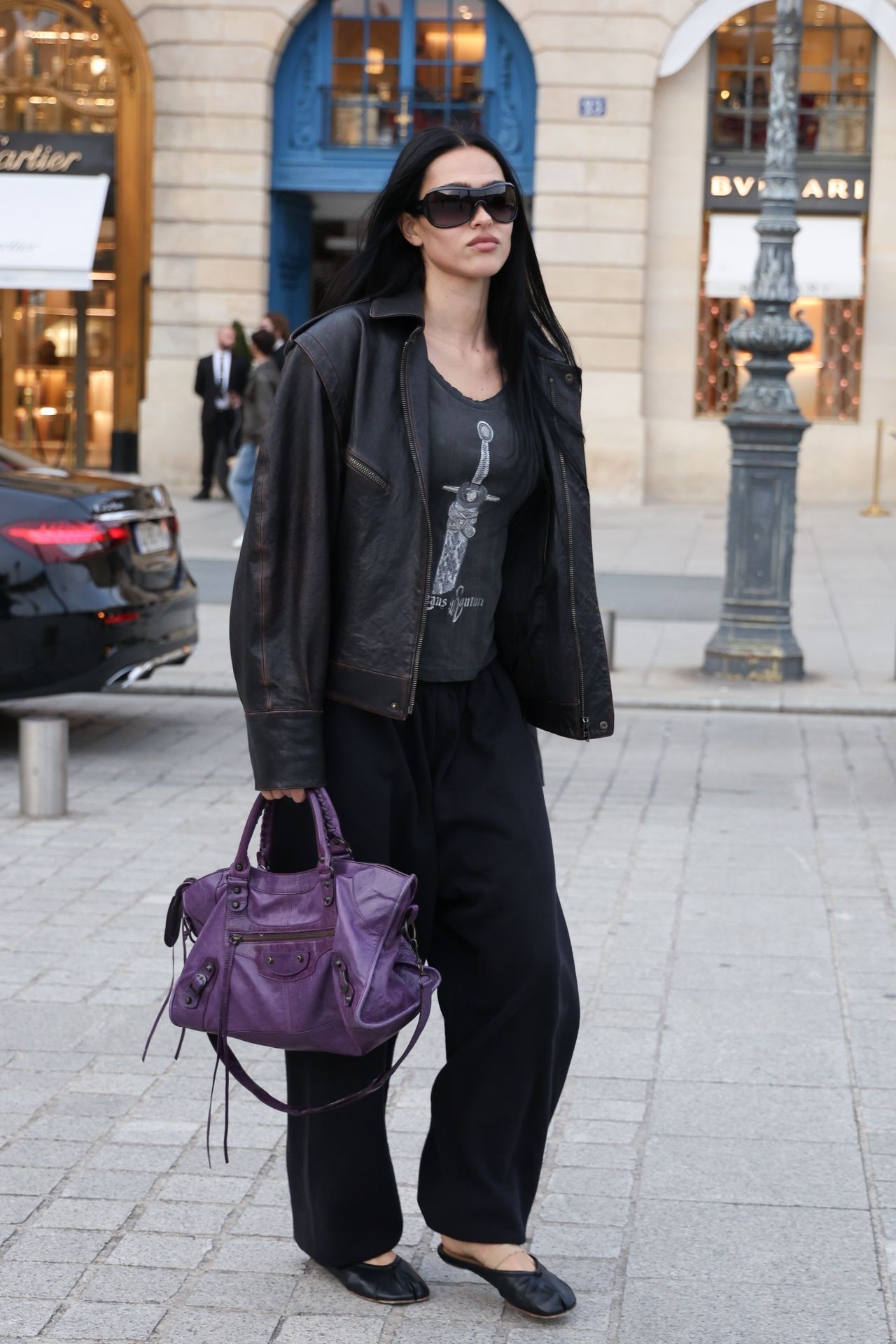Gray’s outfit centers on an oversized, distressed black leather jacket, which provides significant volume and a sense of rugged texture. Worn casually open, the jacket exposes a dark graphic T-shirt featuring what appears to be a stylized sword or dagger motif—a nod to the edgier side of casual chic. The silhouette remains entirely relaxed down to the lower half, where she opts for loose-fitting, black drawstring trousers that fall over flat footwear. This choice emphasizes comfort and an almost slouchy, anti-fashion posture, yet the precision detailing remains. The focal point and deliberate shot of color is the purple Balenciaga City bag, instantly recognizable by its signature studded hardware, which serves as a luxurious counterpoint to the look’s otherwise low-key palette and raw textures. The overall cohesion successfully marries comfortable, everyday outfit elements with high-end designer accessories.