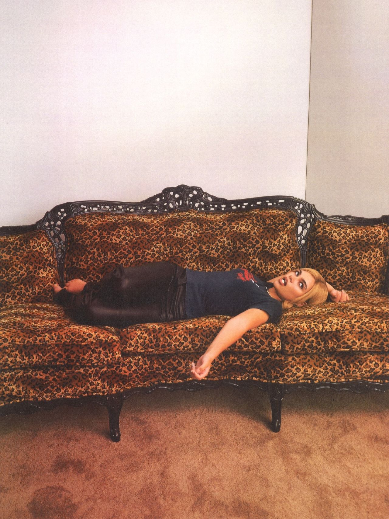 The core of the look is a relaxed, dark-colored graphic T-shirt featuring a stylized red and white print. She pairs this casual top with loose-fitting, wide-leg trousers that possess the sheen and texture of black leather or high-quality faux leather. The accessories are minimal, comprising a thin silver necklace with a small pendant. Greenblatt’s hair is styled in long, center-parted blonde waves, giving a nod to the effortless ‘California cool’ often associated with the era and brand. She is seen posing indoors, seated on the floor in front of a dramatic, vintage-style sofa upholstered in a bold leopard print, which adds a maximalist contrast to her otherwise dark ensemble.