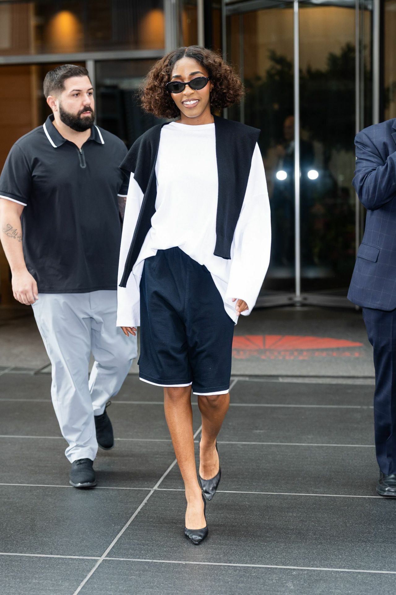 Edebiri’s ensemble plays with traditionally masculine and athletic shapes to achieve a new level of casual chic. She opts for a long-sleeved, oversized crewneck sweatshirt or T-shirt in crisp white, which provides a voluminous and relaxed foundation. This is paired with navy blue board shorts—a silhouette often associated with athletic wear, but elevated here by the tailored drape and contrast white piping along the hemline. The black sweater draped casually over the shoulders creates a diagonal line that breaks up the mass of the white top and adds a collegiate, prep-school sensibility to the overall look.