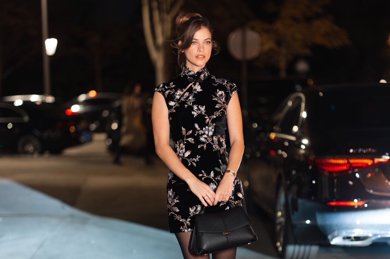 Palvin’s outfit is a strong example of the emerging “Heritage Remix” trend, where foundational global garments are reinterpreted through a contemporary lens. By adopting the Qipao’s neckline and closure but radically altering the length and fit, she positions the look at the intersection of tradition and modern nightlife. Furthermore, the use of velvet fabric and intricate embroidery taps into the recurring “Dark Romance” aesthetic that is perpetually popular for event appearances during the colder seasons, offering a dramatic alternative to typical evening wear. This aesthetic makes the look a fantastic source for photoshoot ideas.