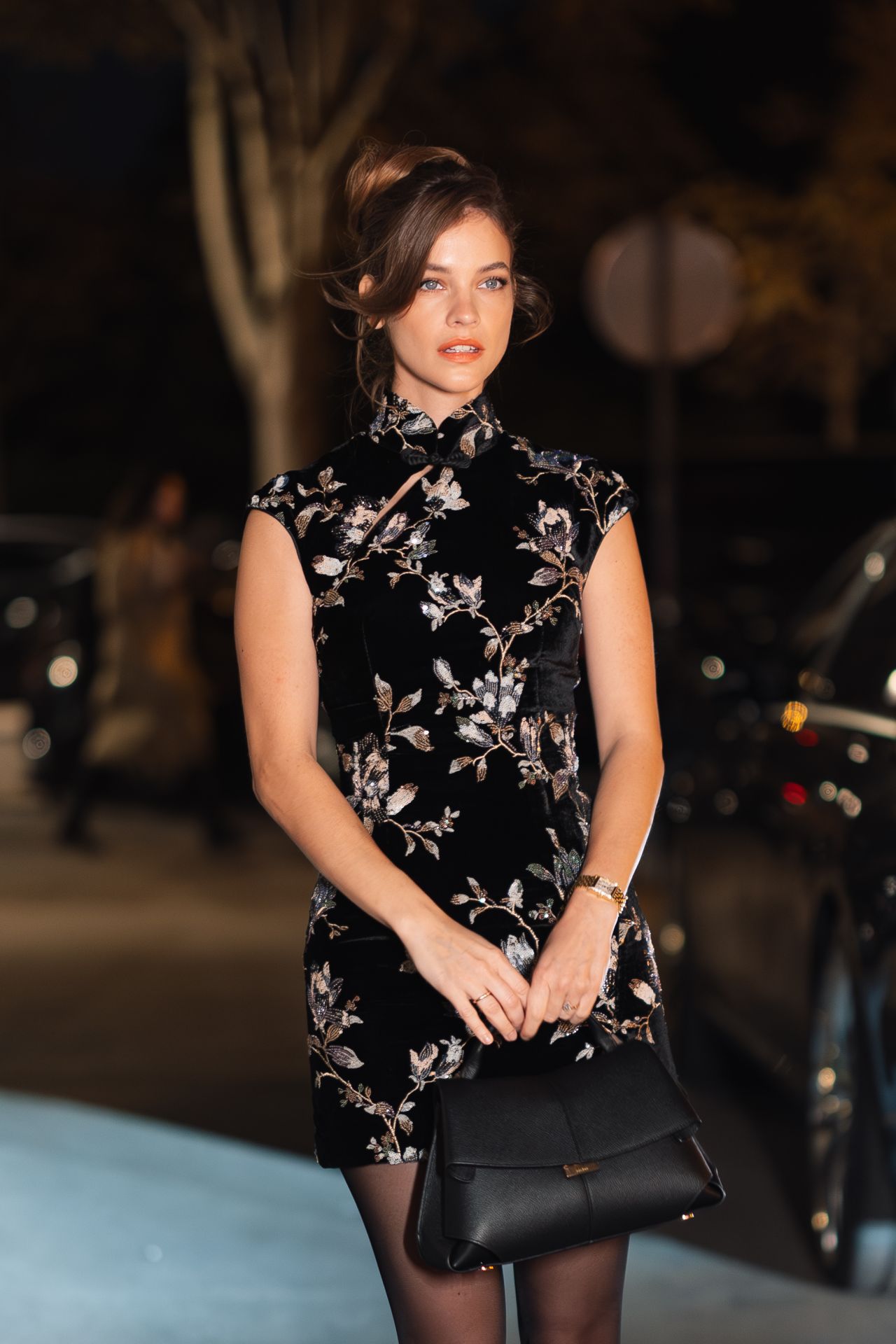 The key to the look is the mini dress, which features a direct, respectful homage to the traditional Qipao/Cheongsam silhouette. It includes a high mandarin collar and tailored cap sleeves, lending an immediate air of structured formality. The material, a rich black velvet, provides a luxurious depth and texture that is ideal for a nighttime event look. Intricate floral embroidery in subtle tones of light pink and cream covers the garment, breaking up the deep black and adding a crucial layer of visual interest. The silhouette is further modernized by a daringly short hemline and a notable side slit, injecting a contemporary, youthful dynamism. Palvin expertly styled the look with sheer black tights, adding continuity, and black pointed ankle boots, which provide a sharp finish. She carried a structured, sleek black leather top-handle bag, maintaining the ensemble’s polished formality.