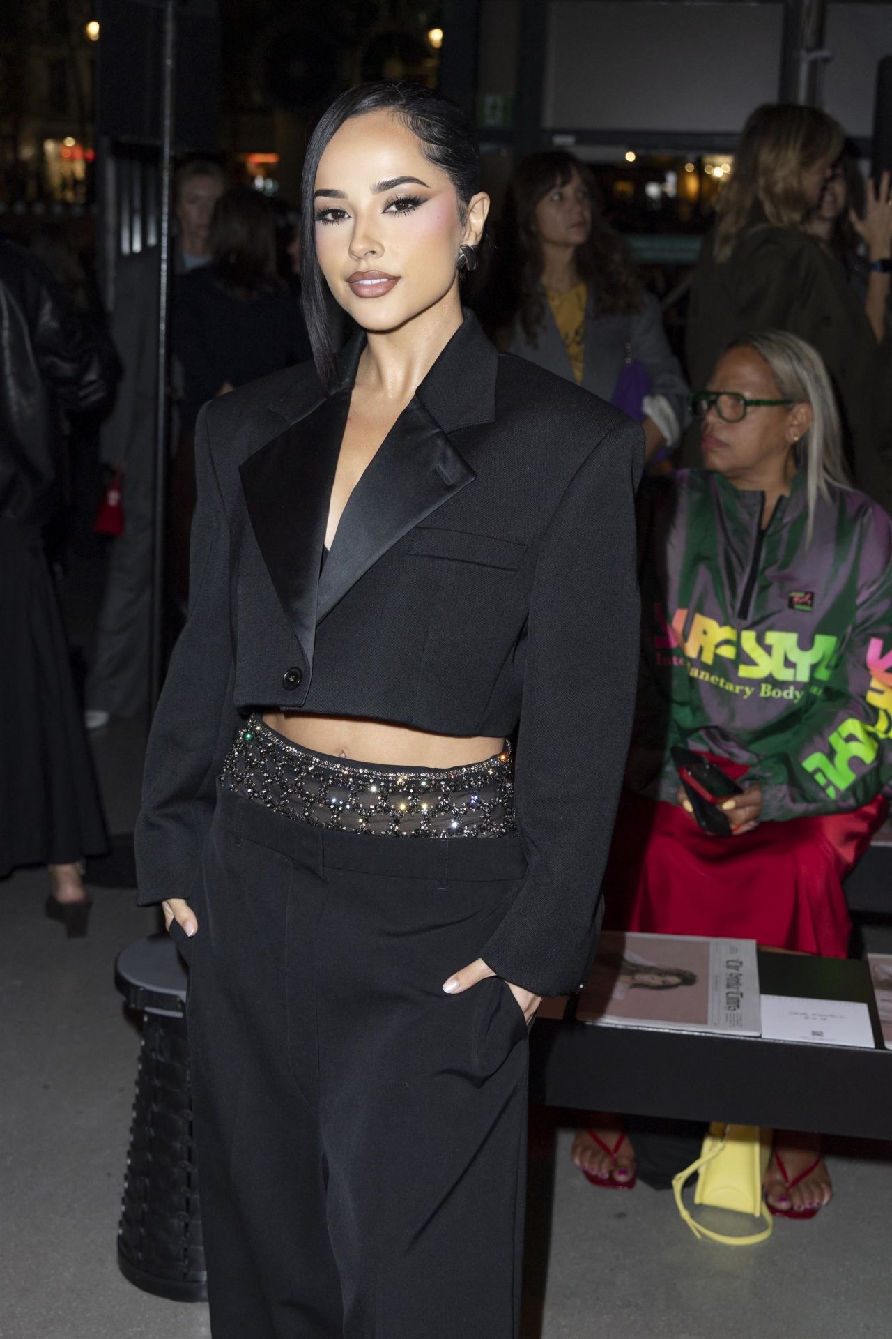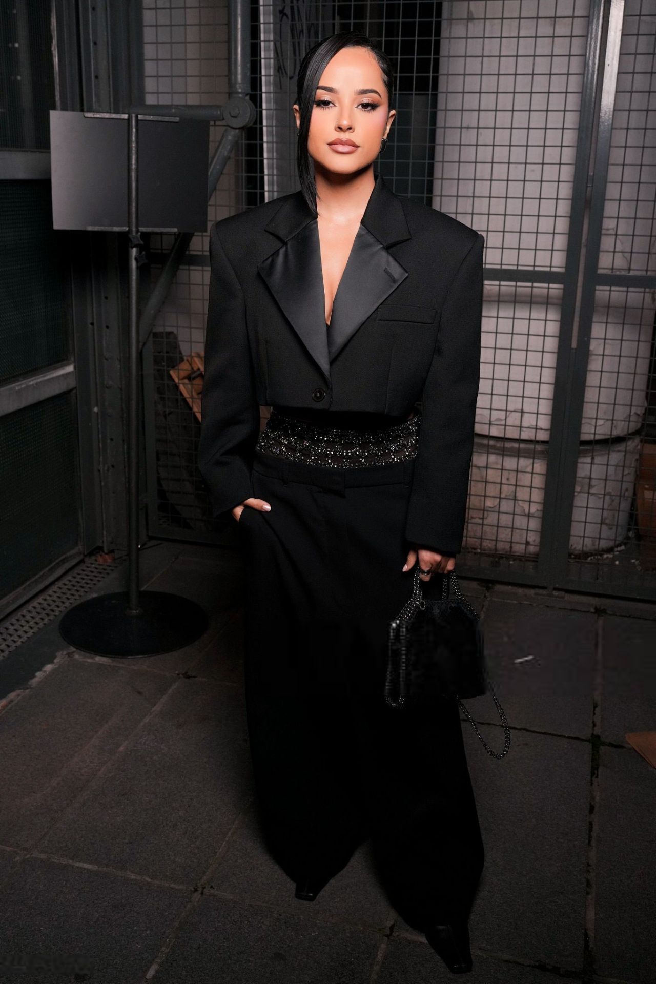 Attending the Stella McCartney presentation in Paris on September 30, 2025, singer Becky G offered a sharp, modern reinterpretation of traditional evening wear. The musician (Becky G) opted for an all-black ensemble built on tailored pieces that challenge conventional proportions, making for a compelling celebrity event look at a key fashion show guest moment. The outfit is sophisticated, emphasizing structure and texture while providing a glimpse of the midriff, a subtle nod to current trends in celebrity style.The focal point of the
