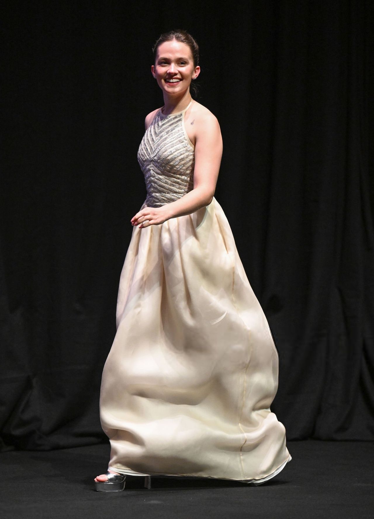 The floor-length gown features a bodice rendered in a halter-style neckline, intricately detailed with silver-tone beading laid out in a geometric, chevron pattern. The beading creates a strong, shimmering contrast against the fluid, voluminous cream or pale champagne-colored skirt. The fabric of the skirt possesses a subtle sheen and drapes beautifully, adding to the garment’s regal quality.