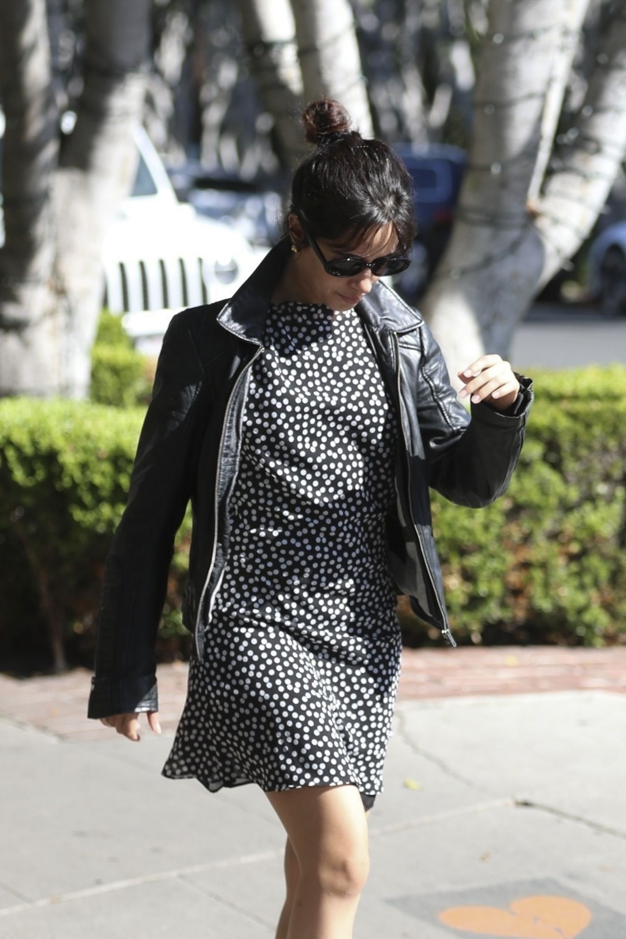 The juxtaposition of the soft, patterned fabric of the dress and the rugged, structured leather jacket is the central thesis of the outfit. For accessories, Cabello maintains the off-duty look with simple black sunglasses and a relaxed, high top-knot hairstyle. Though the provided context mentions Miu Miu Black Satin Ballerinas, the image is cropped and does not show the full footwear, making definitive visual confirmation impossible. However, the styling suggests a focus on ease and comfort appropriate for a shopping trip. The look is entirely unpretentious, prioritizing both comfort and a clear, high-contrast aesthetic.