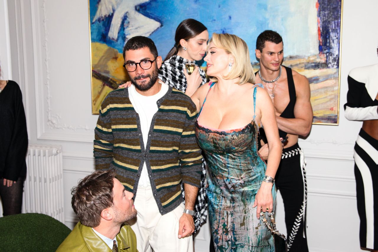 Attending the Christian Siriano Spring/Summer 2026 Cocktail and Collection Preview on Rue de la Neva, Paris, on 30.09.2025, Caroline Vreeland selected a visually arresting, iridescent garment. The fitted, knee-length piece features thin spaghetti straps and a low-cut neckline, embracing a body-conscious silhouette. Its defining characteristic is the hypnotic, abstract print, which shifts between deep teal, copper, emerald, and azure, resembling oil on water or a digitally rendered liquid metal. Vreeland—who often epitomizes aspirational celebrity style—pairs the dress with silver, mirrored pointed-toe pumps that wrap around the ankle, enhancing the outfit’s high-shine finish. Accessories were minimal but impactful, consisting of delicate drop earrings and a slender bracelet. Her blonde hair is styled in loose waves, complementing the glamorous, siren-like aesthetic of the look.