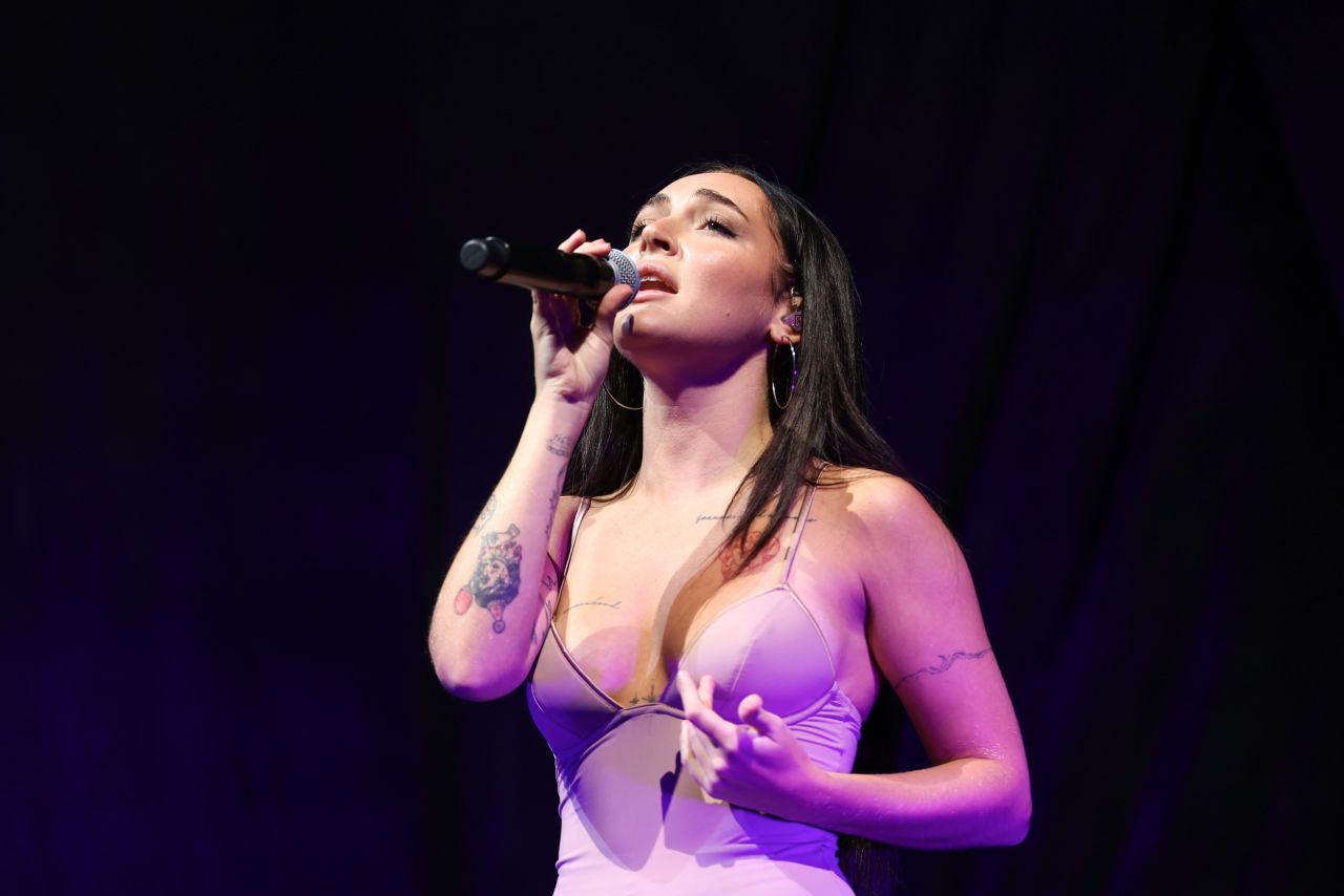 The detailing is minimal but effective. The garment’s visible seams below the bust serve a dual purpose: providing structure while simultaneously referencing classic lingerie construction. CIL’s dark, long hair is worn sleek and straight, contrasting with the soft color palette of her outfit. Her makeup is centered around a bright, clear complexion with defined eyes and a light lip. Tattoos are visible on her arms and chest, adding an authentic, personal layer to the performance style.