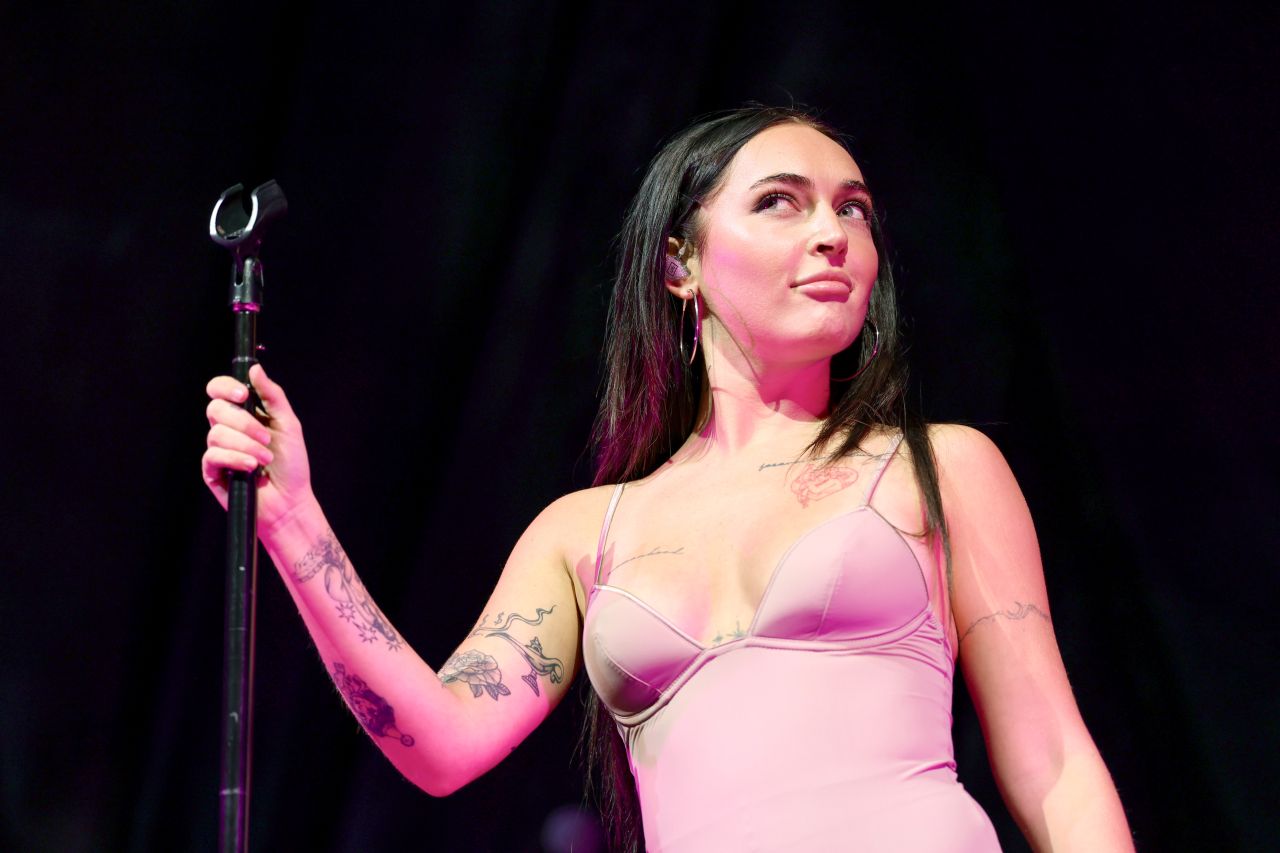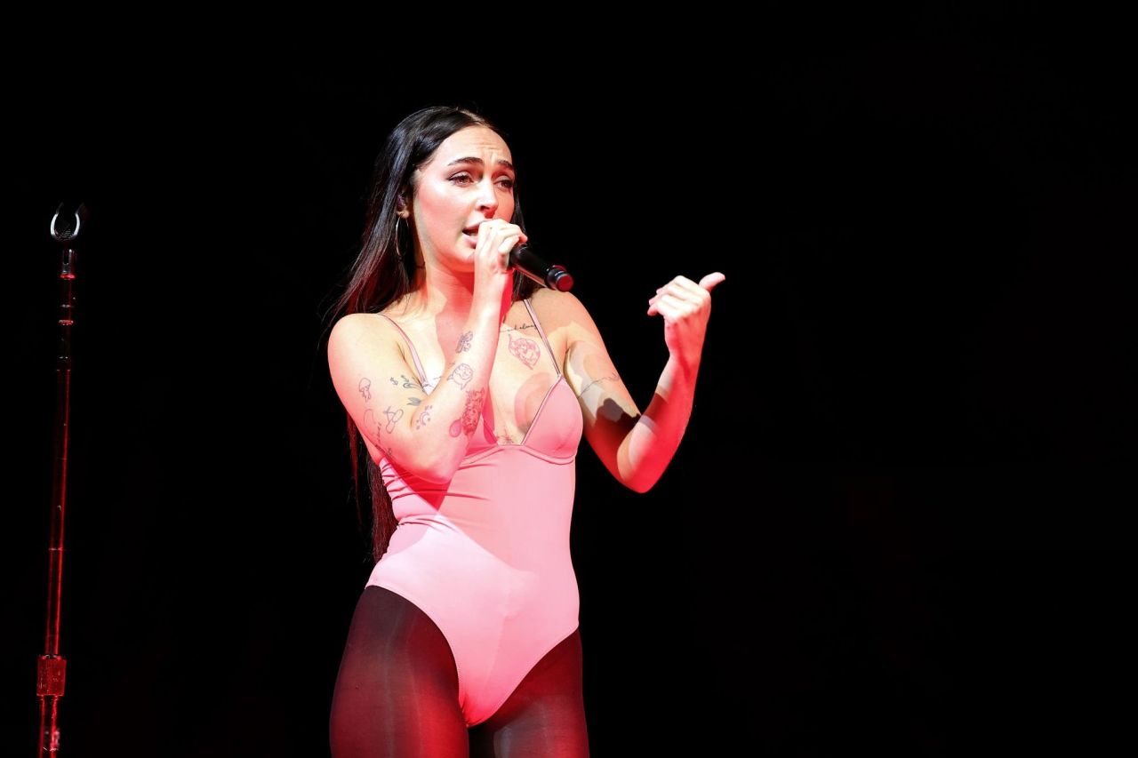 CIL, the dynamic opening act for Dua Lipa’s Radical Optimism Tour, delivered a bold statement on stage at the American Airlines Center in Dallas, Texas on October 1, 2025, embracing a look that channels the edgy minimalism of 1990s stage wear. Her choice of a pale pink, lingerie-inspired garment paired with opaque black hosiery marks a deliberate, almost deconstructive approach to pop performance fashion, effectively blending vulnerability with assertive rock-and-roll attitude. The outfit is a strong fit for her presence on stage, putting her in the spotlight moment while supporting the celebrity performance look aesthetic often seen in popular celebrities like Dua Lipa herself.