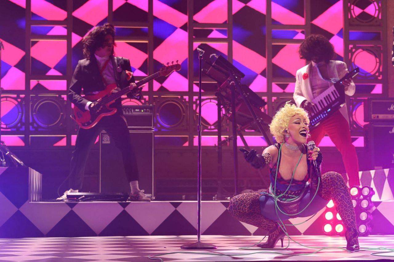 Doja Cat took to the Saturday Night Live stage on October 4, 2025, delivering an arresting celebrity performance look that combined elements of Gothic punk, 1980s new wave, and high-fashion lingerie. The complex onstage fashion centers on a structured corset over a patterned catsuit, perfectly capturing the artist’s current aesthetic focus on maximalist texture and bold theatricality. The vibrant purple stage lighting and geometric checkerboard floor—reminiscent of a two-tone ska album cover—amplify the outfit’s edgy vibe, making it a quintessential spotlight moment that asserts her fashion dominance in the popular celebrities category.