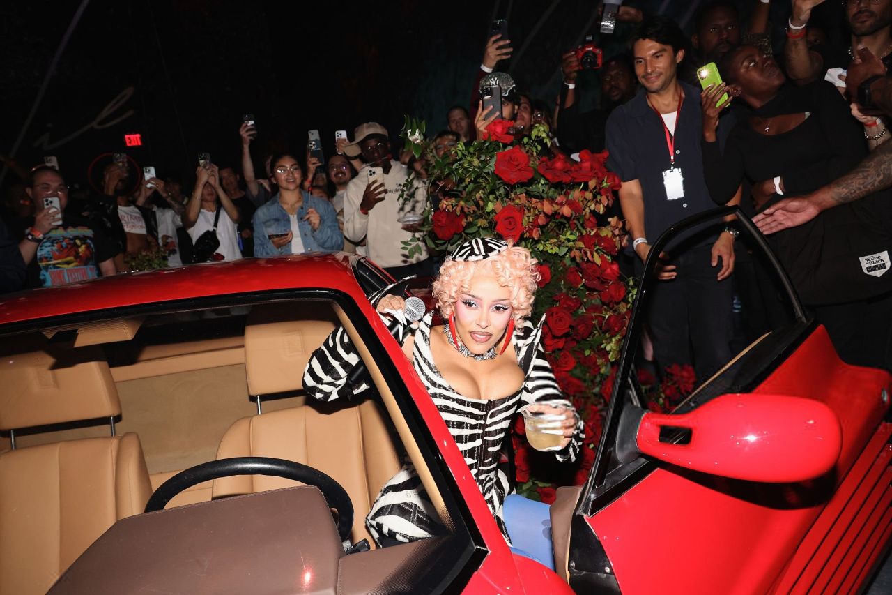 For her “VIE” Album Launch Celebration on September 29, 2025, the genre-bending artist Doja Cat [https://en.wikipedia.org/wiki/Doja_Cat] embraces a look that channels bold statement dressing with a clear, conceptual focus. The outfit, which served as a provocative public appearance moment, centers on a highly structured zebra-print corset, boldly paired with electric blue sheer tights. The entire presentation confirms her position as a celebrity willing to subvert traditional norms of celebrity event look glamour in favor of high-impact, conceptual fashion, adding a vibrant new entry to her rapidly evolving personal celebrity style.