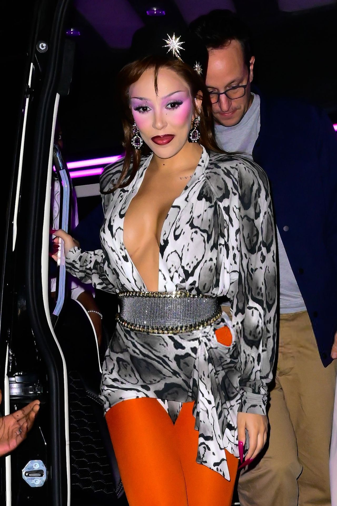 Stepping out in New York City on October 1, 2025, Doja Cat [https://en.wikipedia.org/wiki/Doja_Cat] presented an audacious event appearance look that reinforces her reputation for high-octane, conceptual fashion. The outfit, perfectly tailored for an eye-catching media event, is built on a high-contrast visual thesis, pairing a complex serpent/snake-skin pattern with a shock of solid, hyper-saturated color. The entire ensemble functions as a maximalist experiment in texture and color theory, serving as a standout example of her evolving celebrity style.