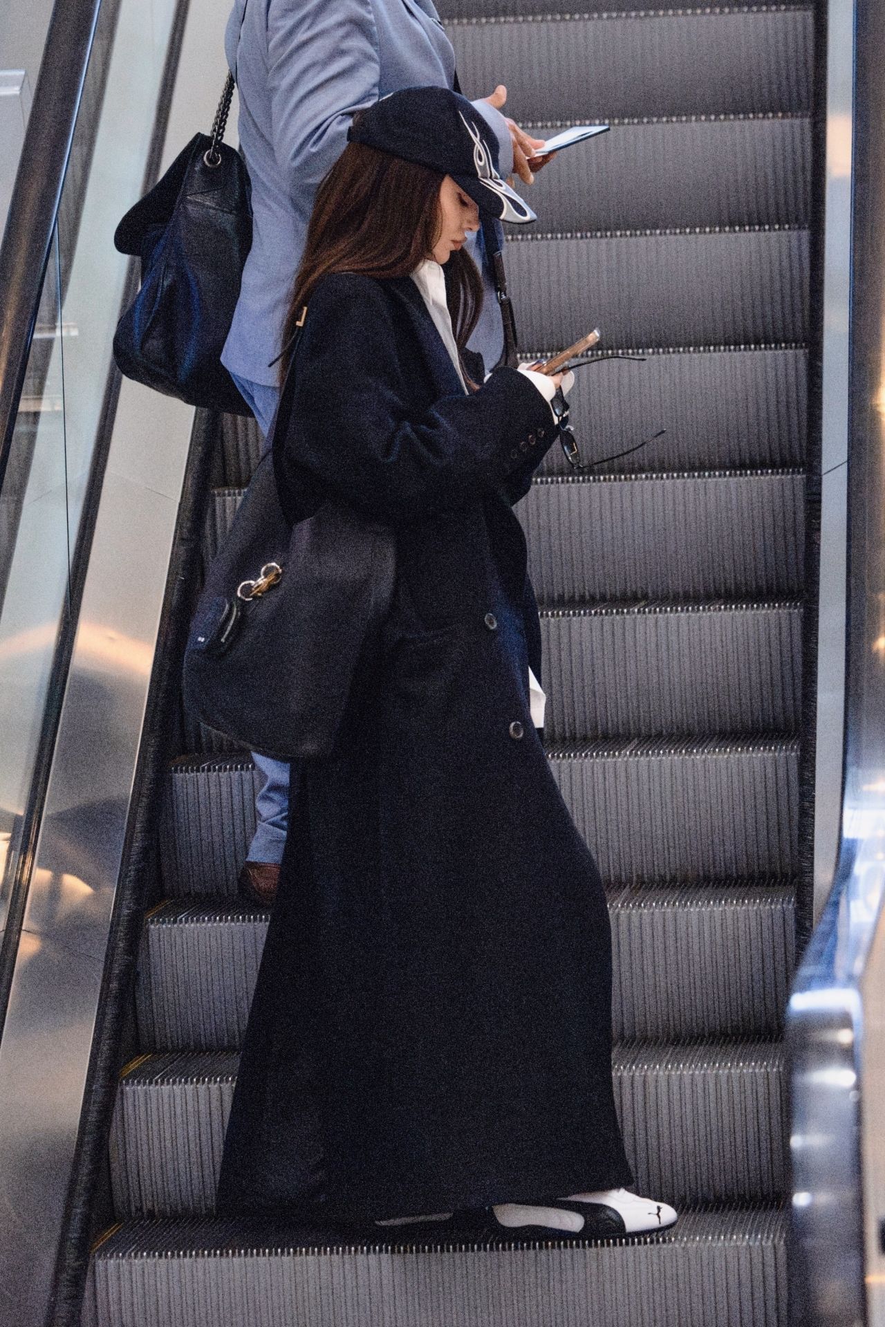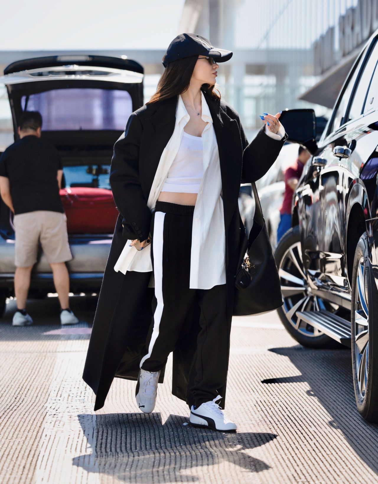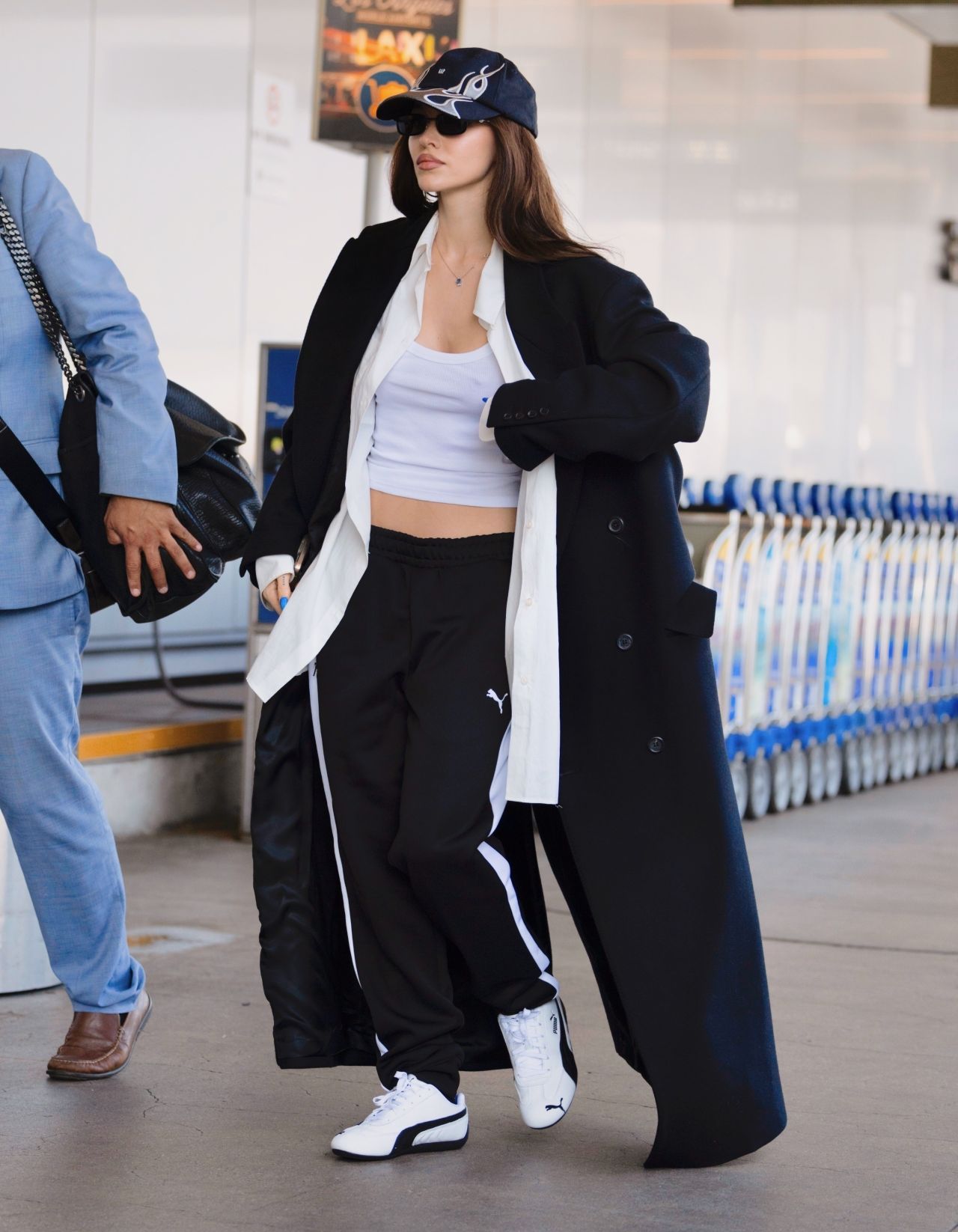 Dove Cameron, a mainstay of contemporary, was photographed at LAX in a masterful demonstration of chic streetwear. The core of her outfit is a dramatic, floor-length black wool overcoat, which immediately lends a sense of power and structure to the otherwise relaxed look. Underneath, she wears a white, slightly cropped tank top paired with black Puma track pants featuring a thick white side stripe. This contrast of high drama and low-key comfort is what defines the ensemble.