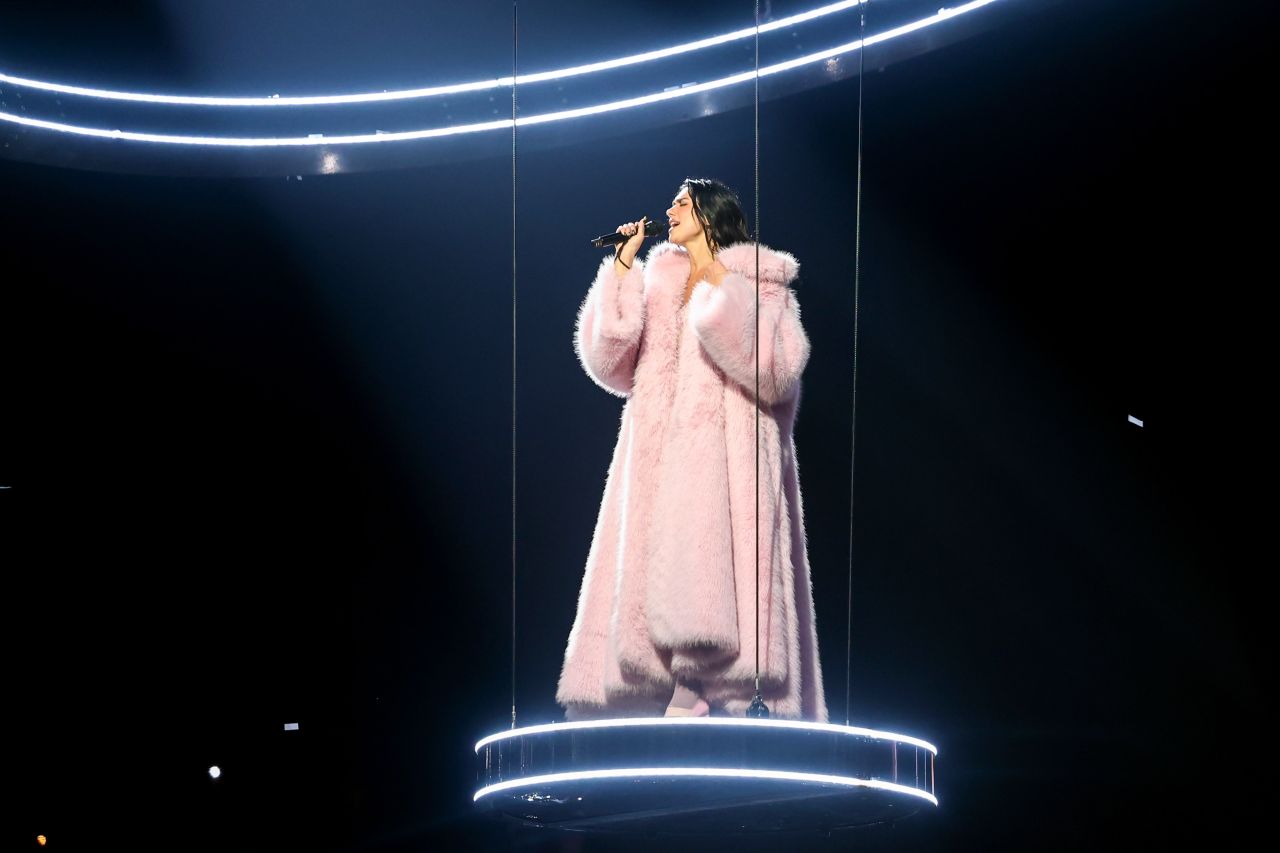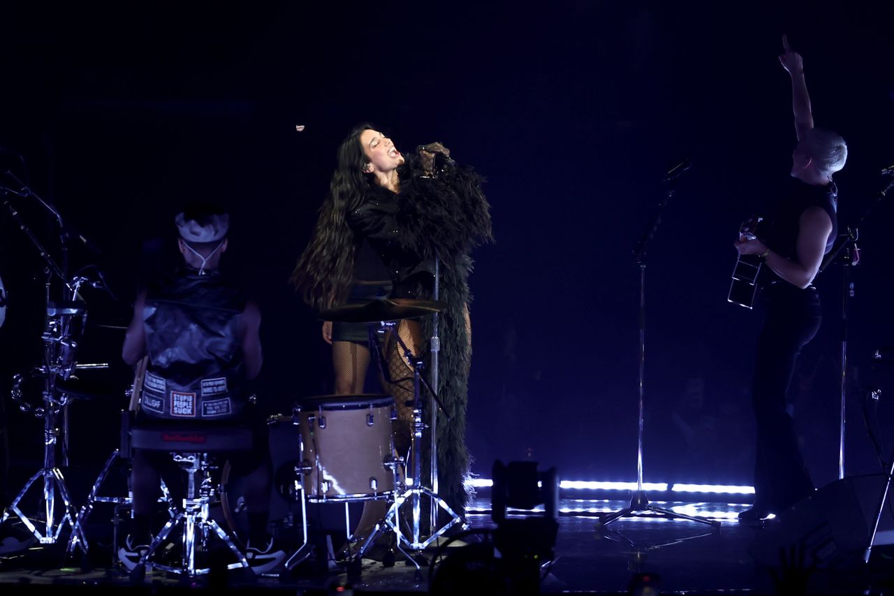 Dua Lipa commands the stage on night 4 of her Radical Optimism Tour at the Kia Forum, Los Angeles CA, on October 8, 2025. Her wardrobe for the tour is defined by high-impact, dance-ready pieces, and this particular look is arguably the most striking.