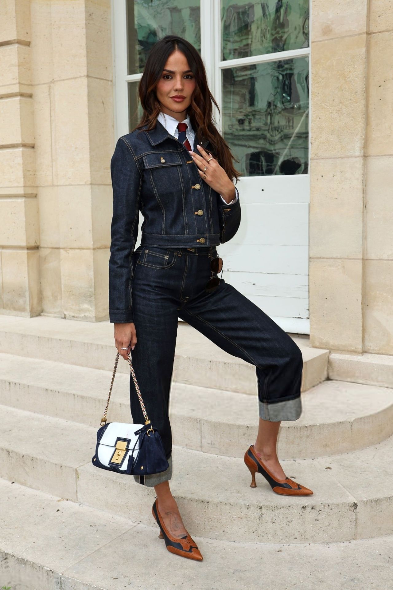 Underneath, Gonzalez wore a dark wash denim jacket and matching cropped, cuffed jeans, creating a modern “Canadian tuxedo” effect. This denim-on-denim base was sharply contrasted with a crisp white collared shirt and a bold red tie, a clear nod to Thom Browne’s preppy, uniform-inspired ethos. Her accessories further cemented the curated look: Thom Browne TBS-917 01 Sunglasses, a structured Thom Browne Fall 2025 Bag in navy and white with a subtle geometric pattern, and tan-colored brogue-style pumps with a distinctive wingtip detail, echoing classic menswear footwear.
