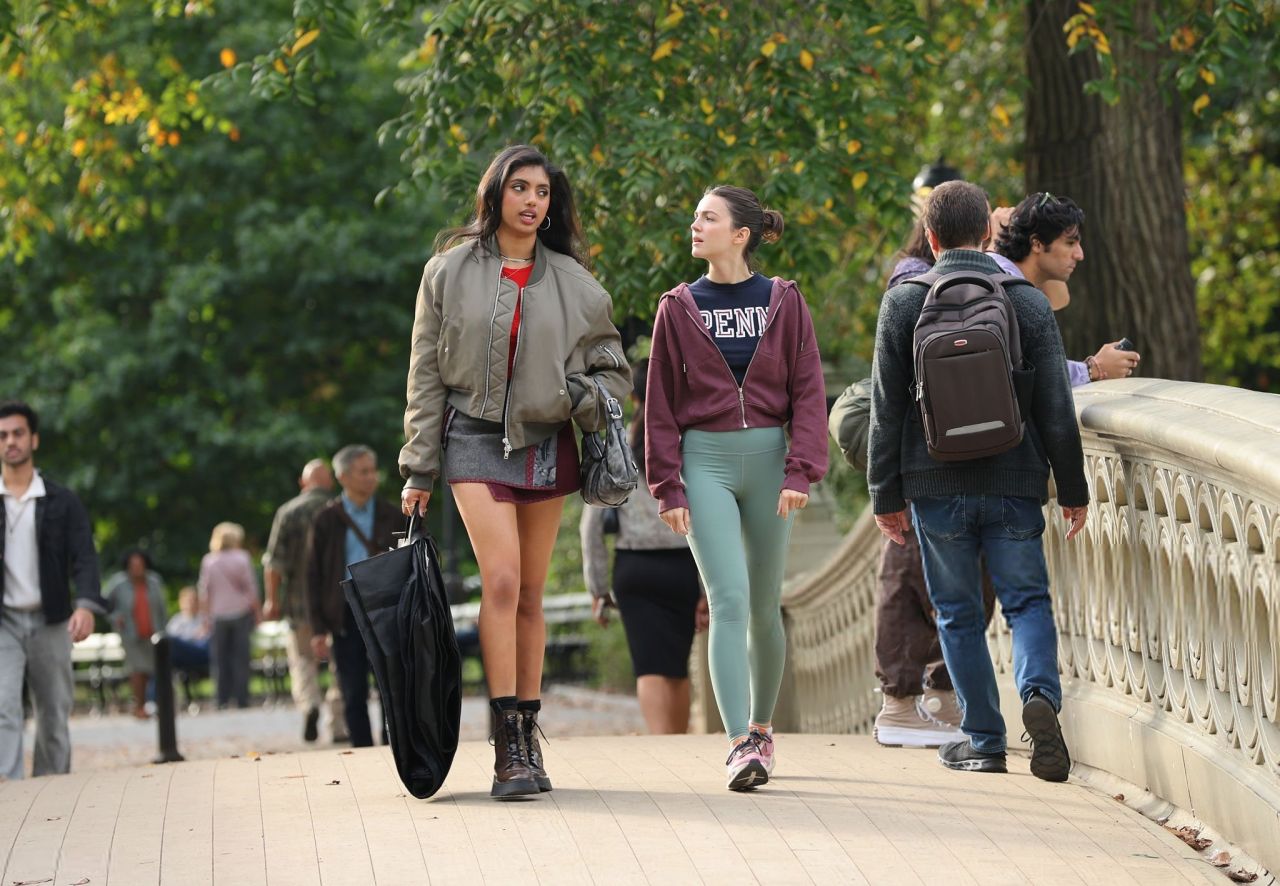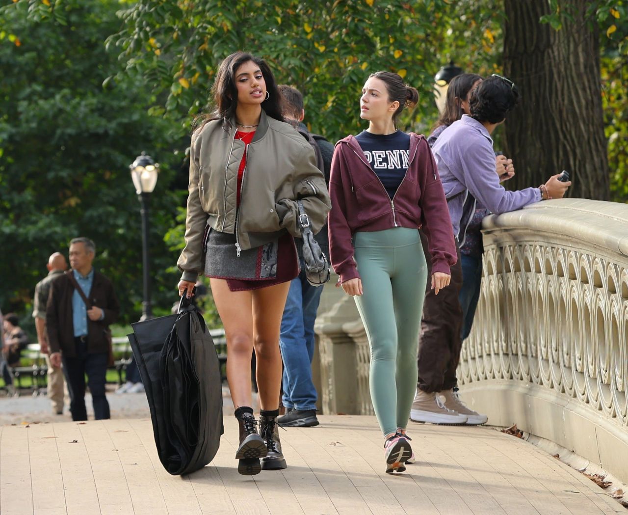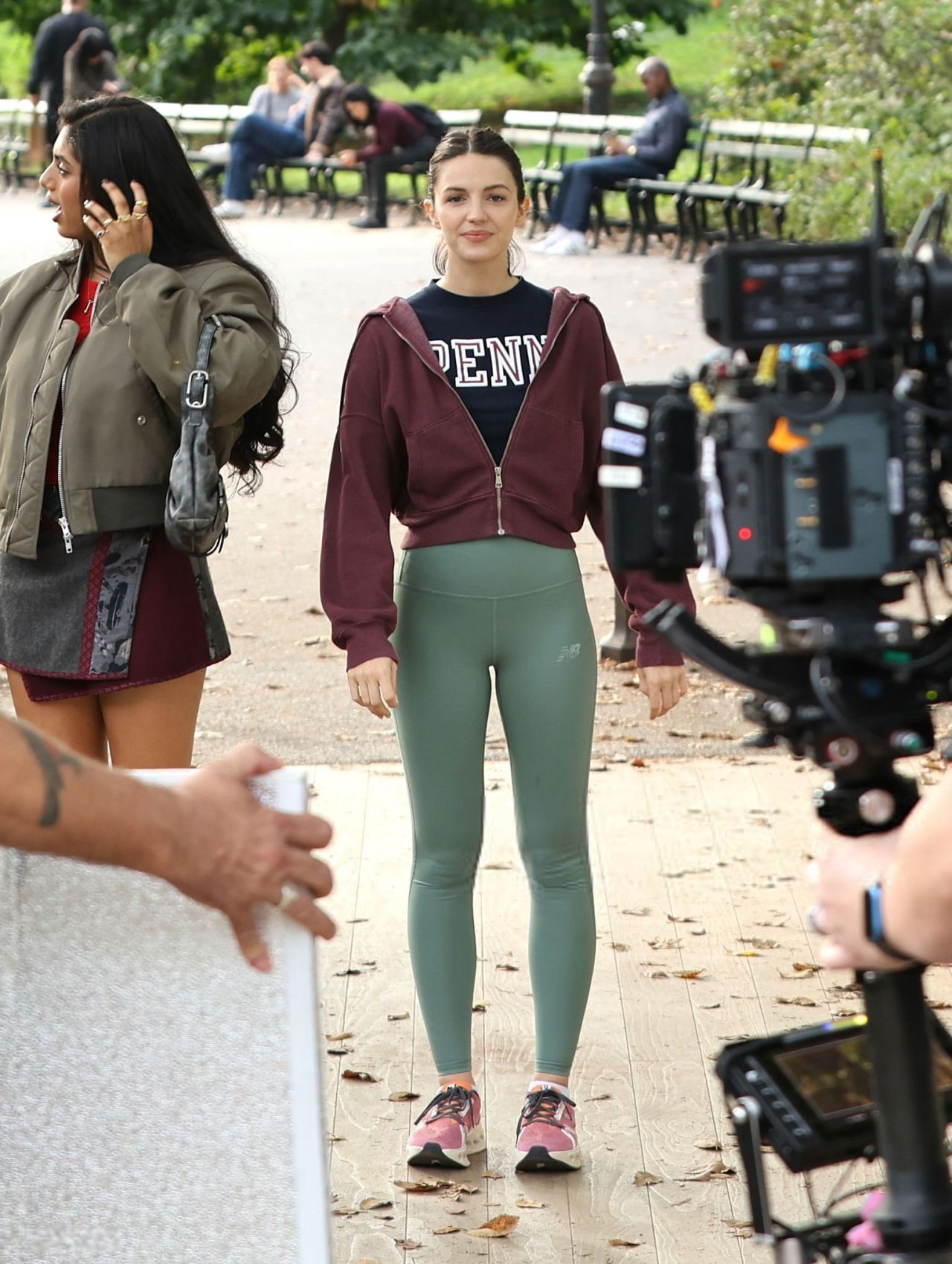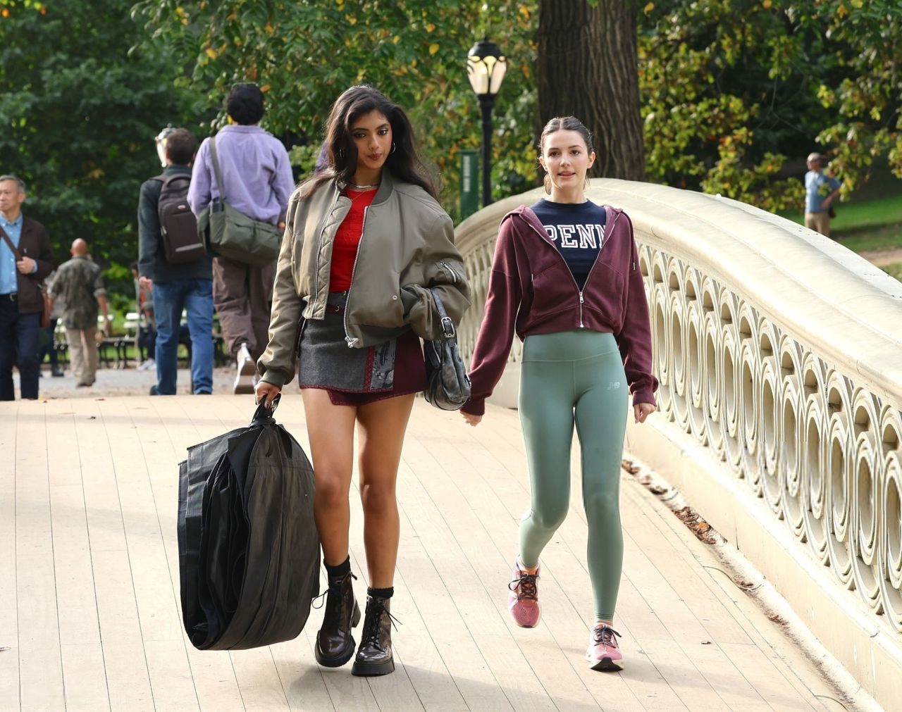Ella Hunt’s off-duty look for the Not Suitable for Work set is a masterclass in balancing comfort and style. The actress paired a cropped maroon zip-up hoodie—layered over a fitted black long-sleeve top—with high-waisted teal leggings and pink-and-white athletic sneakers. The hoodie’s bold color and zip detailing add a playful contrast to the sleek leggings, while the sneakers inject a youthful, energetic vibe.