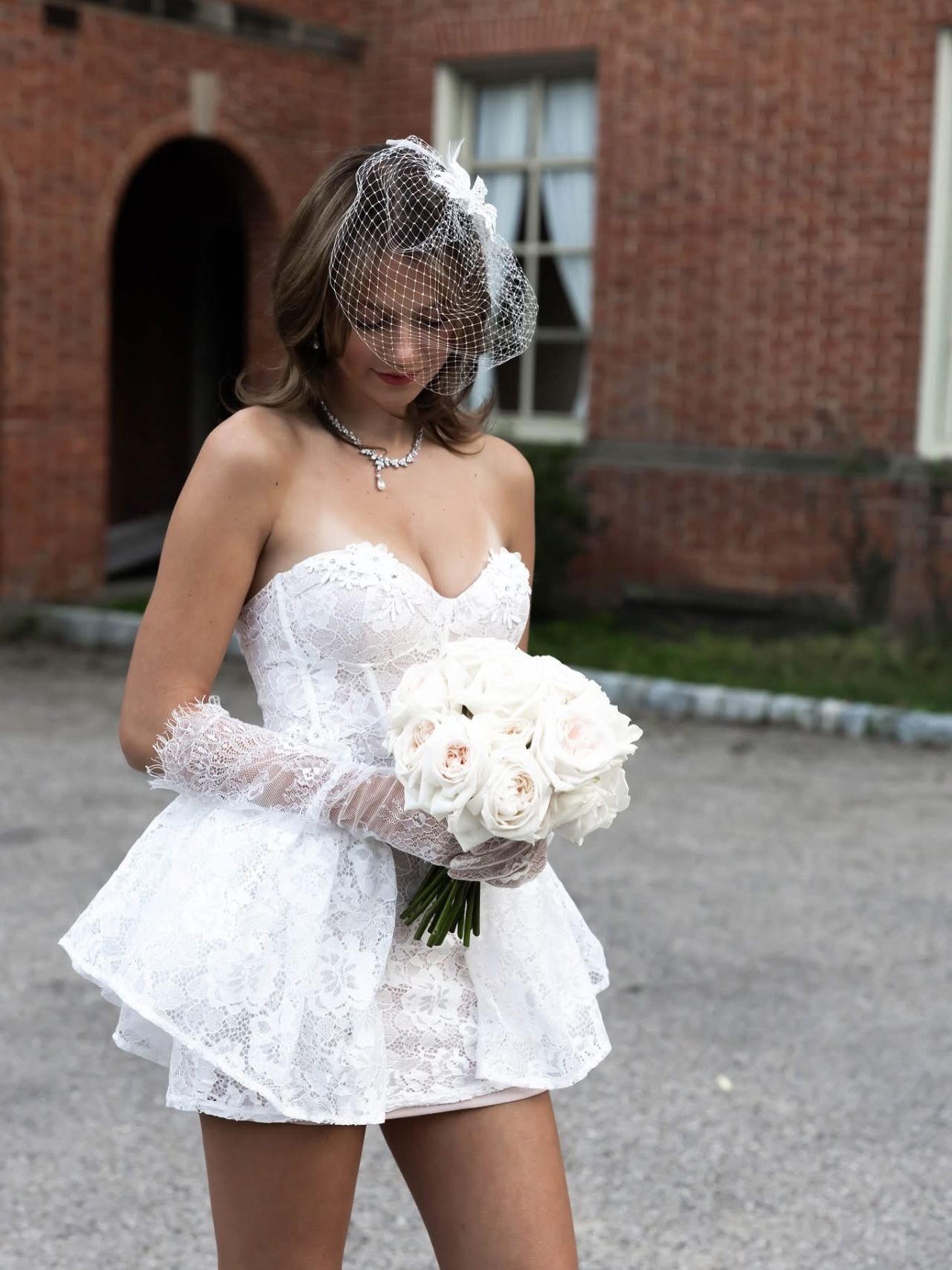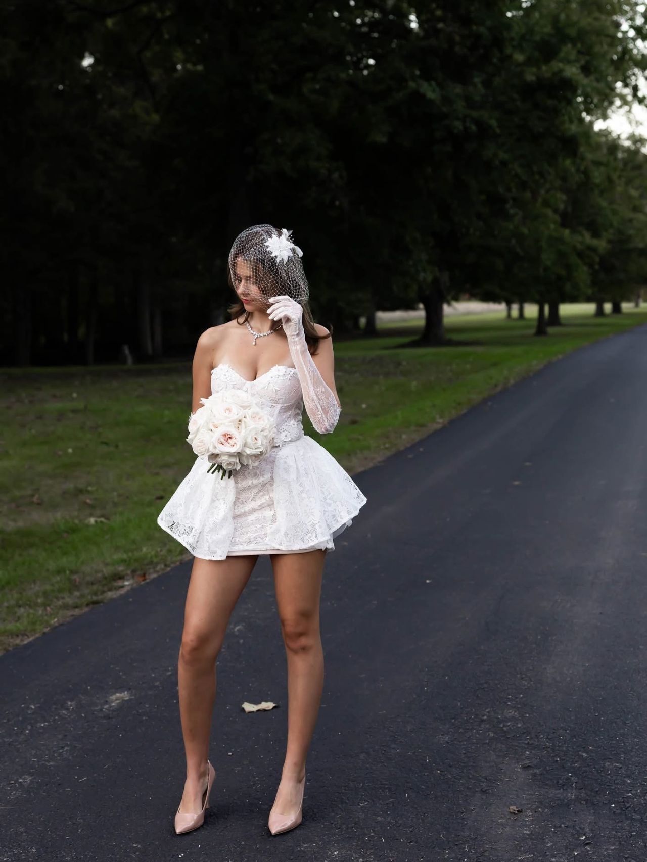 The ensemble is richly accessorized with white opera-length gloves, a delicate beaded necklace, and a small, vintage-inspired veiled headpiece secured with a white floral accent. She carries a classic bouquet of white roses and pairs the look with nude pointed-toe pumps. Her choice of accessories, particularly the gloves and the veil, juxtaposes with the short hemline to create a dramatically stylized image, often sought after in contemporary fashion photoshoot work.