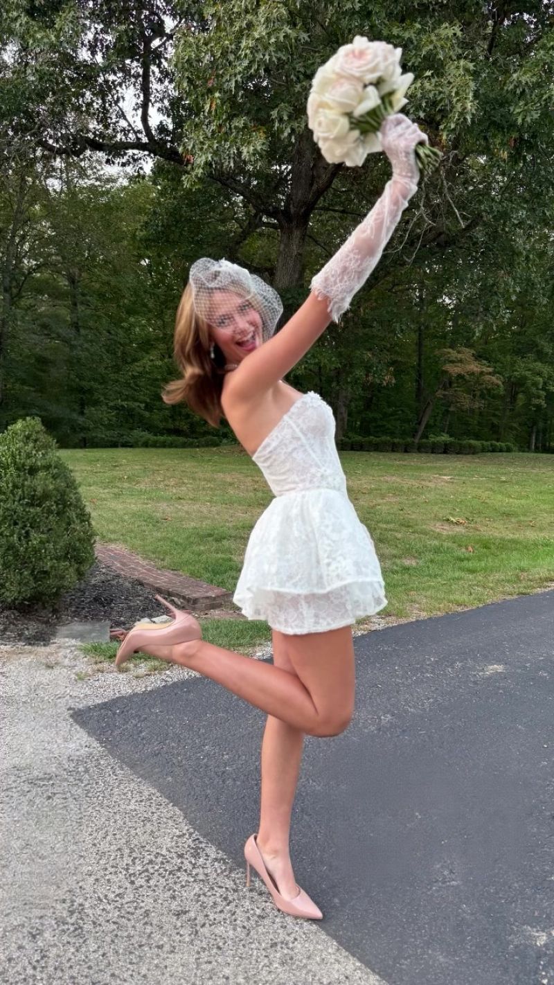 Elyse Hofer models unconventional bridal wear for a styled shoot by Magnolia Valley Photography in October 2025. The centerpiece of the look is a strapless mini dress crafted from white lace with a sweetheart neckline and an emphasized, flounced tulle or lace skirt overlay at the waist. The outfit rejects the traditional floor-length silhouette for a youthful, high-fashion statement.