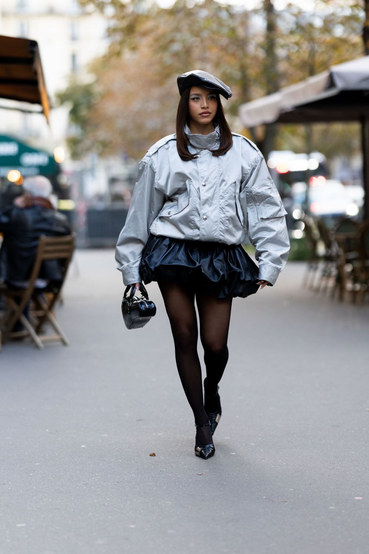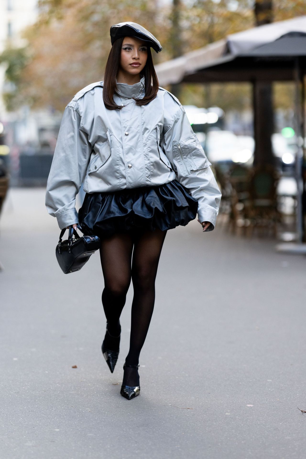 A sophisticated mix of materials added depth to the monochromatic palette. The bomber jacket was crafted from a technical nylon with a subtle sheen, giving it a utilitarian feel. In direct contrast, the puffball skirt and matching beret appeared to be made from a high-shine faux leather or patent material. This textural dialogue—between matte and glossy, soft and structured—was further enhanced by sheer black tights and gleaming metallic pewter pumps.