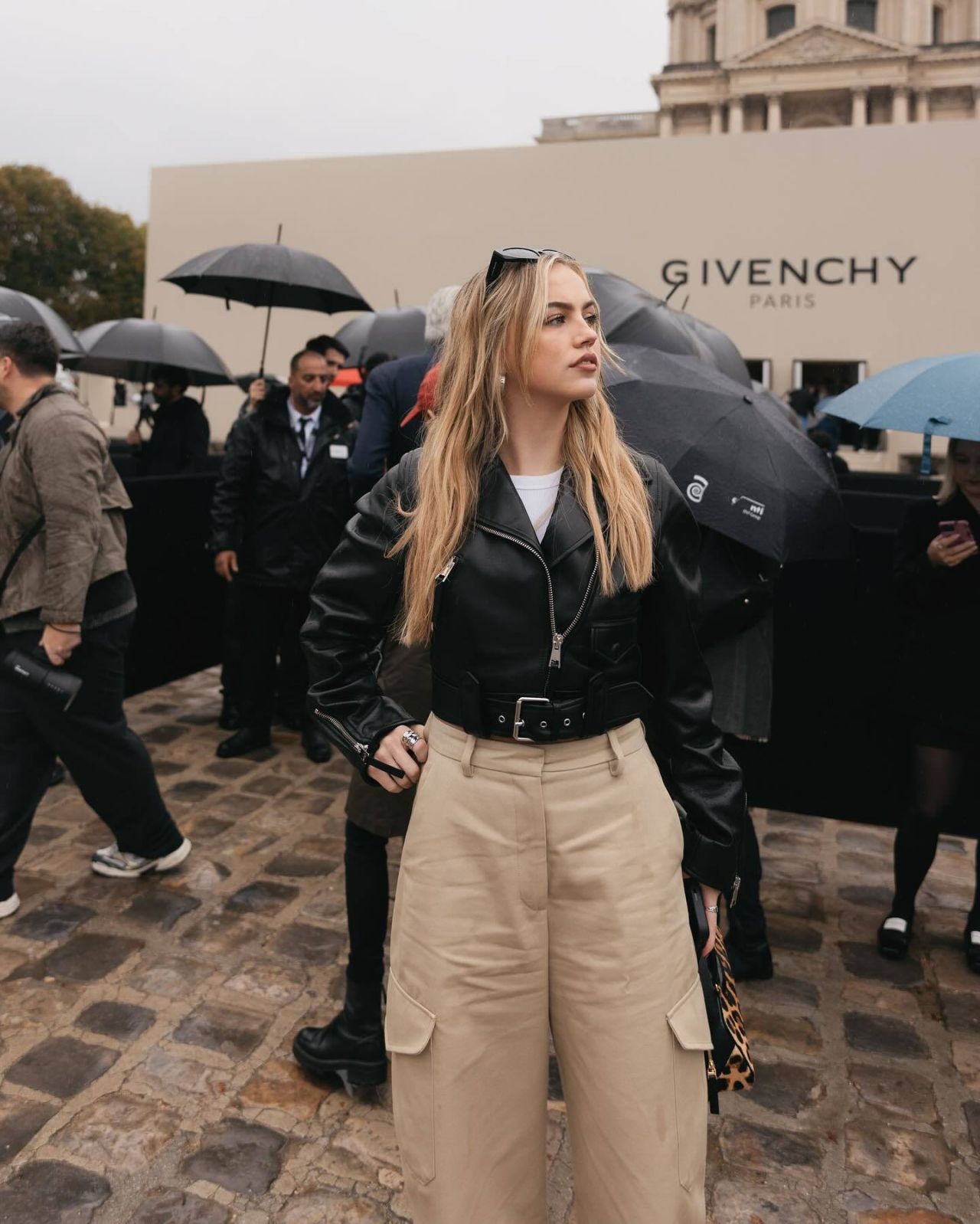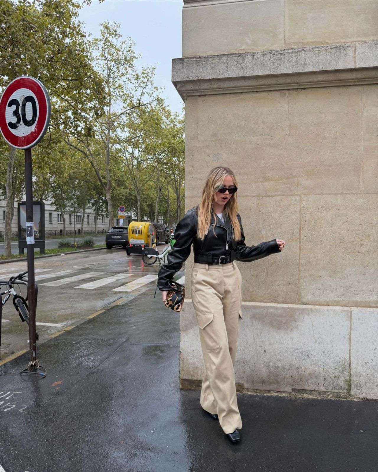 In a candid moment captured during her October 2025 photoshoot, Emma Brooks delivers a masterclass in urban edge. The look is anchored by a cropped black leather jacket, its structured silhouette and oversized lapels evoking a rebellious yet polished vibe. The jacket’s cropped length reveals a fitted white top, creating a striking contrast against the high-waisted beige cargo trousers. The trousers, with their utilitarian pockets and wide-leg cut, add a functional yet fashionable twist to the ensemble.