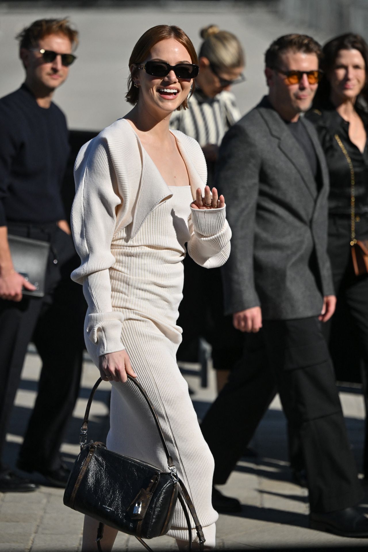 Arriving at the Louis Vuitton Spring/Summer 2026 show during Paris Fashion Week, actor Emma Stone (known for roles in La La Land and Poor Things) presented a look that expertly balanced architectural structure with comfortable street style minimalism. The ensemble, featuring a creamy white, heavily-ribbed midi-length garment, served as a masterclass in texture and silhouette control. She grounded the monochromatic look with sharp, black accessories, proving that sometimes the most impactful statements are the quietest. This appearance places her firmly in the conversation of popular celebrities whose fashion choices consistently reflect an elevated, modern sensibility, often favoring the house of Louis Vuitton.