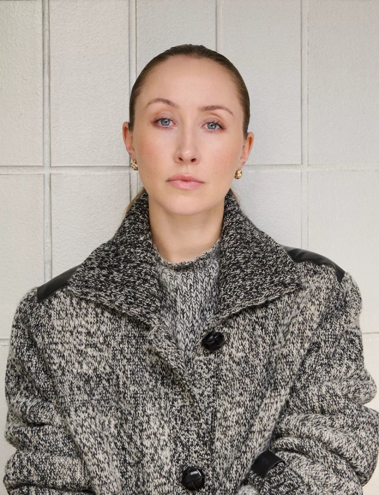 The styling decision for the beauty shot reinforces the garment’s drama: Doherty’s hair is slicked back into a severe, low style, pulling focus entirely to the intensity of her gaze and the architectural nature of the ruffles. The clean, minimal makeup palette ensures the graphic, monochromatic check remains the undisputed focal point of the styled shoot. This approach achieves controlled drama, preventing the complex textural elements from becoming visually discordant. In another look from the same fashion spread, she opts for a structured black jacket featuring intense puff sleeves, continuing the theme of sharp, powerful silhouettes.