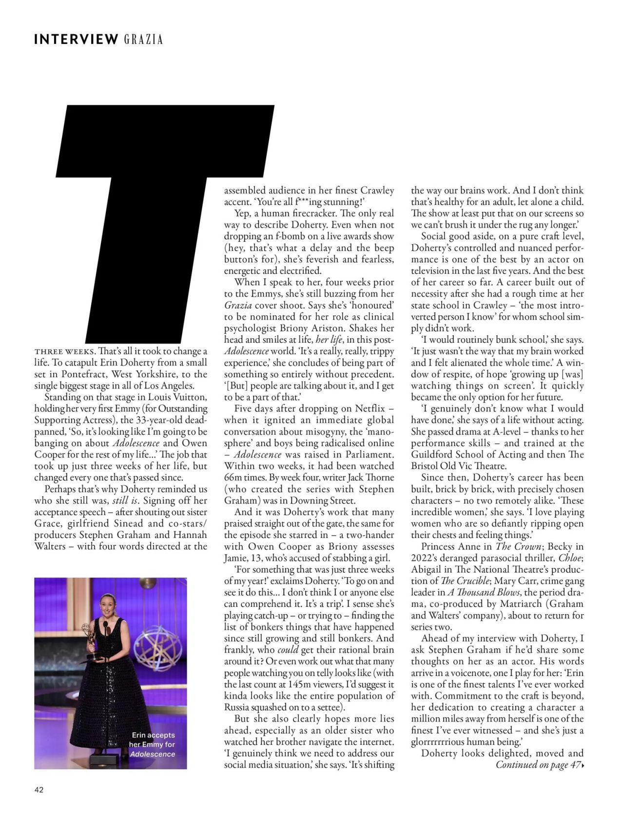 Erin Doherty, the Emmy-winning star of the series Adolescence (a show that sparked national conversation about misogyny and social media), confirms her ambition to constantly “keep surprising people”. Reflecting on her career trajectory after training at the Guildhall School of Acting, Doherty discusses moving away from predictable intellectual roles to focus on more “singular projects”. She is now drawn to roles, particularly those where women “take control of their own destiny”, highlighting themes of feminism, identity, and the power dynamics of her industry. The overall narrative of her interview is one of intentional professional growth, prioritizing meaningful expression over passive acceptance of conventional roles.