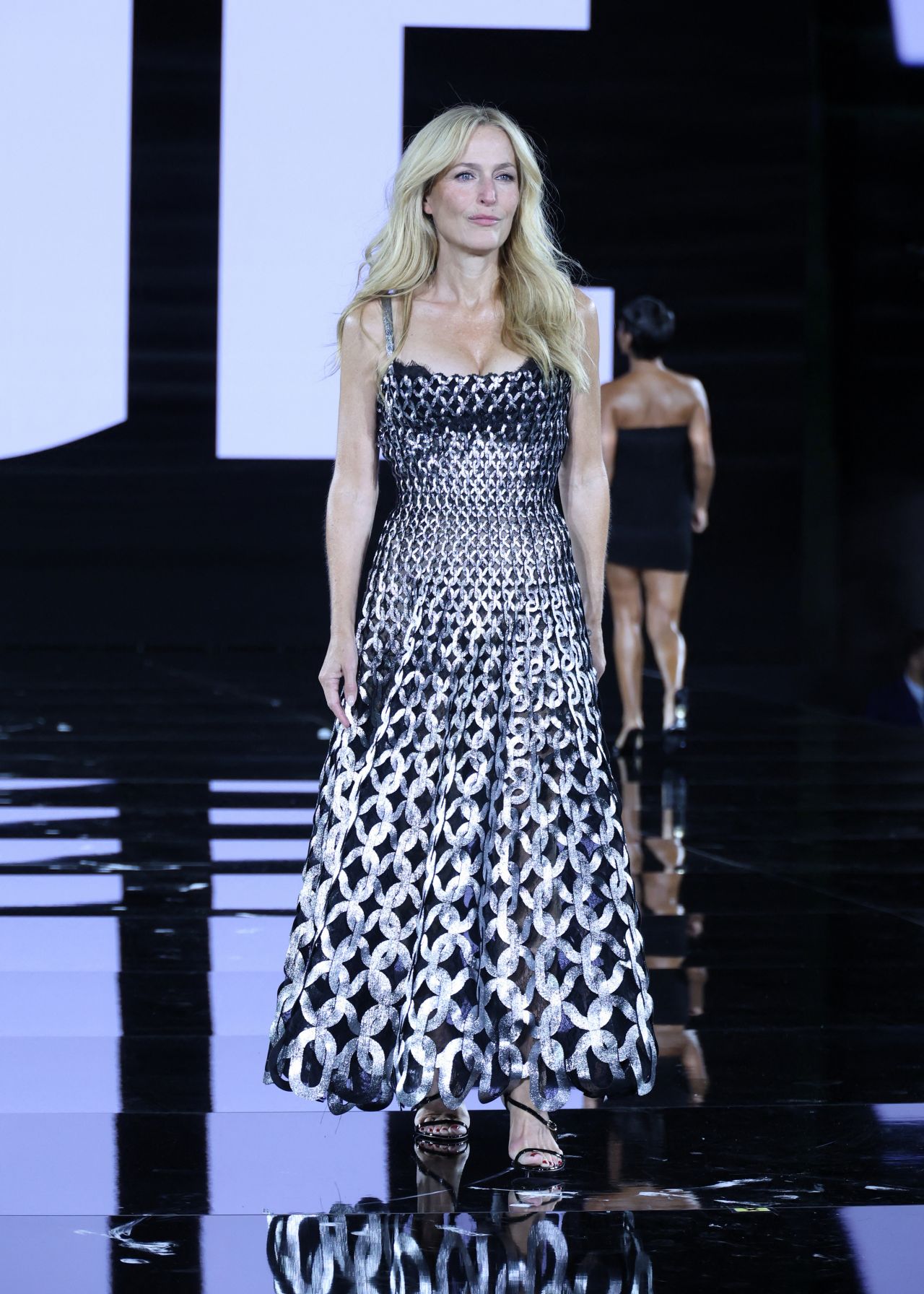 Gillian Anderson (https://www.imdb.com/name/nm0000096/) has firmly cemented her status as a red carpet and event appearance veteran, and her look at the L’Oréal show in Paris on September 29, 2025, continued this streak of sophisticated style. Known for embracing both sharp tailoring and fluid, feminine silhouettes, the actress selected a striking black and silver dress that perfectly captured the dynamic energy of the fashion week setting. The dress is a masterclass in controlled shine, utilizing metallic embellishment and a sheer overlay to deliver impactful celebrity event look without relying on overt volume or color, affirming her position among popular celebrities known for subtle elegance.