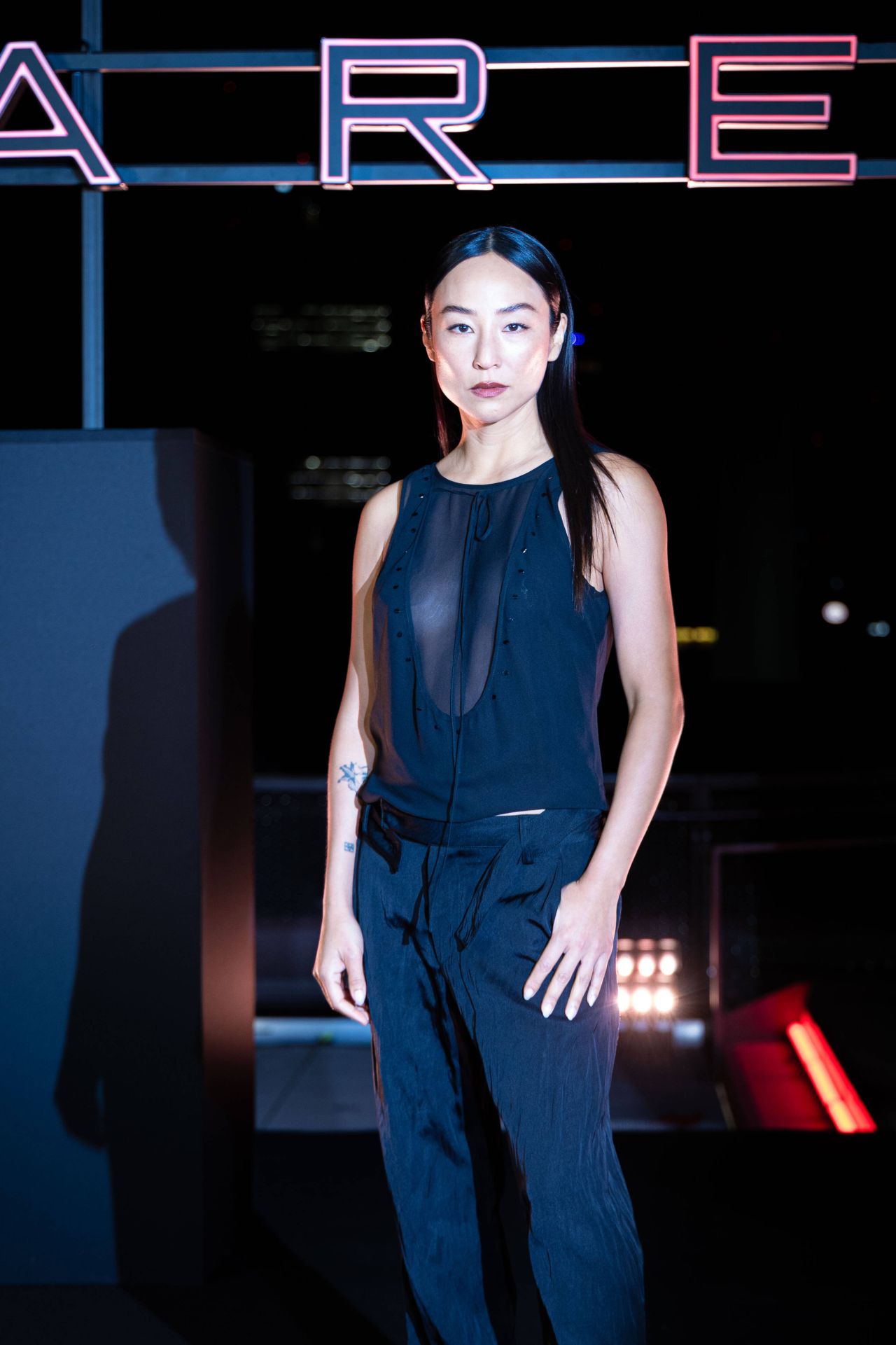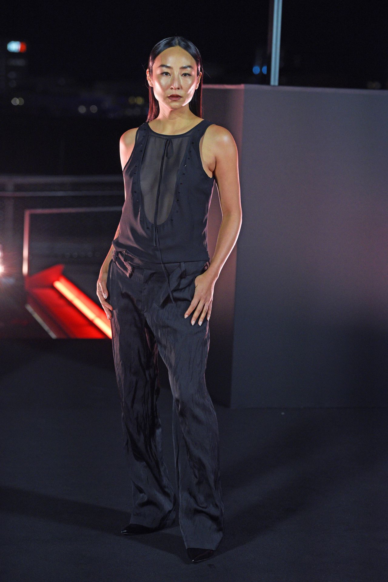 Greta Lee attended the premiere of Tron: Ares at Humboldt Forum in Berlin, Germany, on September 30, 2025, presenting a highly conceptual and deconstructed red carpet fashion look. Lee opts for a charcoal grey ensemble, confirmed as Eckhaus Latta Spring 2026, which challenges the typical formality of red carpet arrivals with its utilitarian elements and unconventional transparency. The outfit’s blend of workwear-inspired pieces and avant-garde sheer panels makes it a definitive fashion moment that aligns with the aesthetic of high-concept cinema and showcases her sophisticated approach to designer outfit choices.
