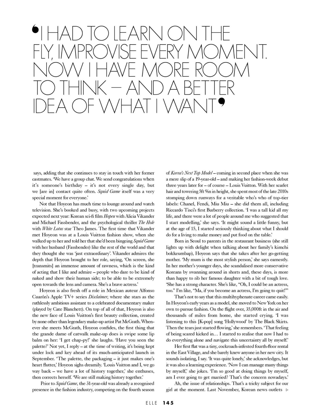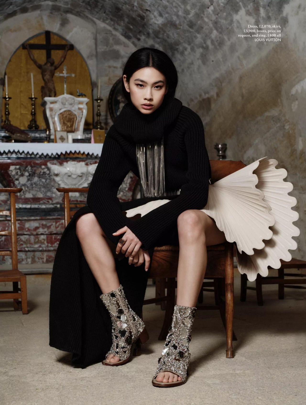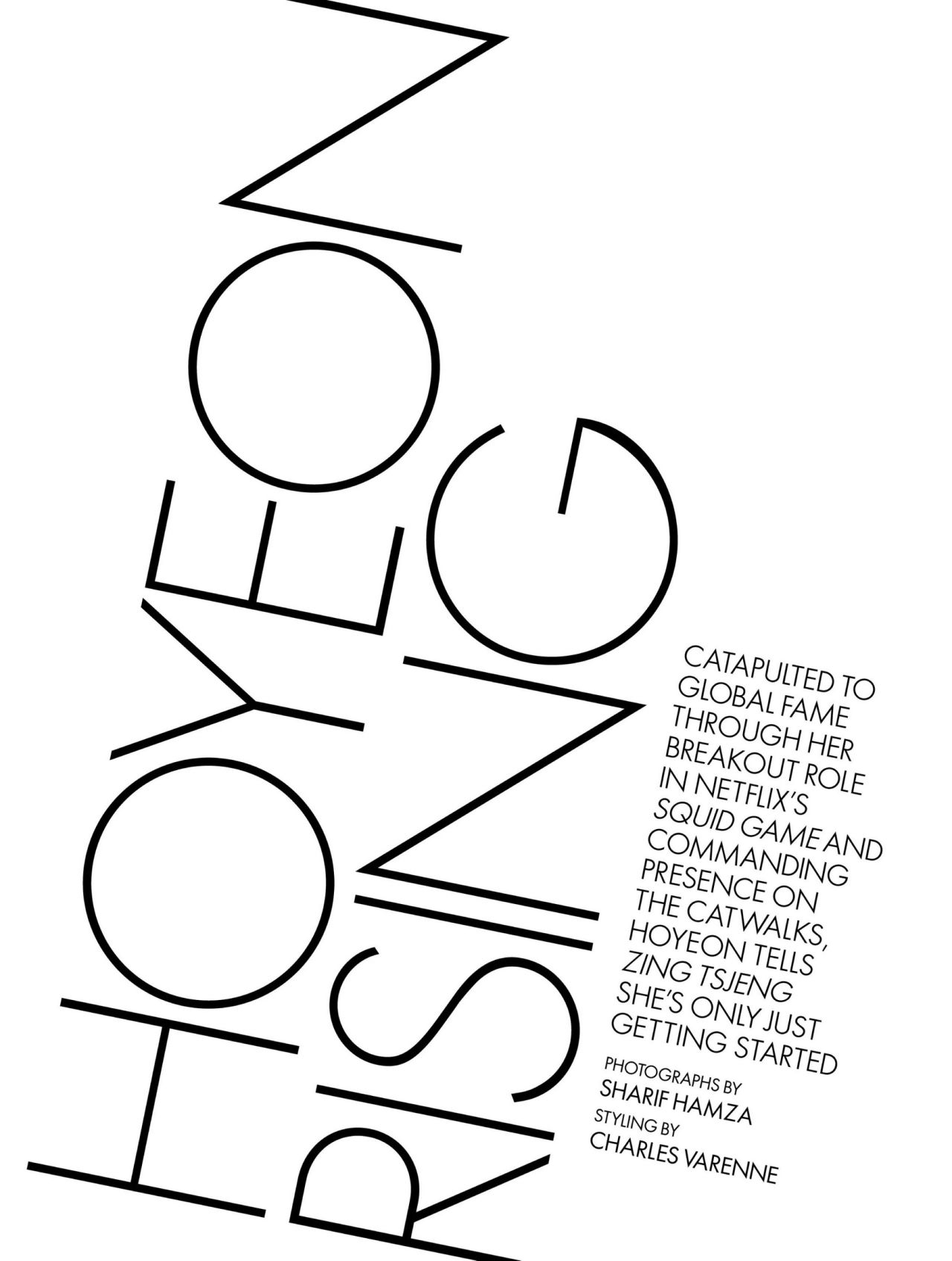 HoYeon Jung, the South Korean model and actress, commands attention in Elle UK’s November 2025 editorial. She is captured in a striking metallic jacket from Louis Vuitton, its iridescent fabric catching the light and evoking a futuristic, almost armor-like aesthetic. The jacket’s structured silhouette and oversized fur collar add a touch of drama, while the bold blue graphic eyeliner and deep red lip create a high-impact beauty moment.