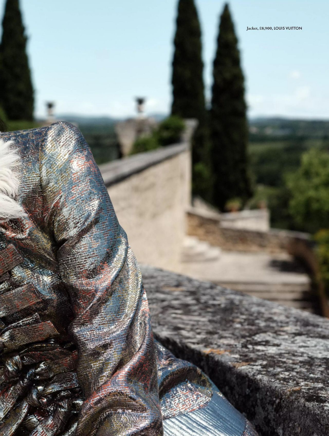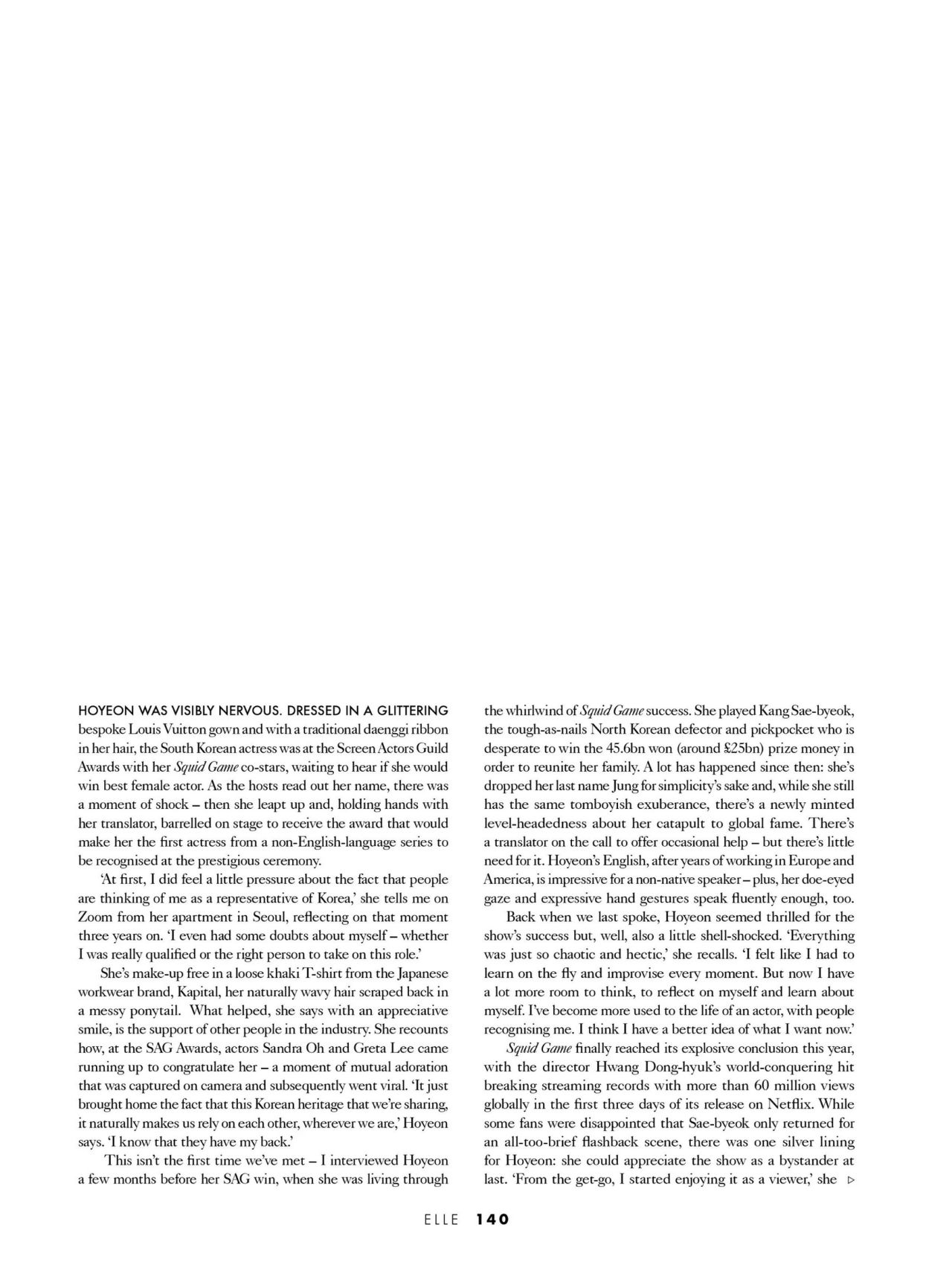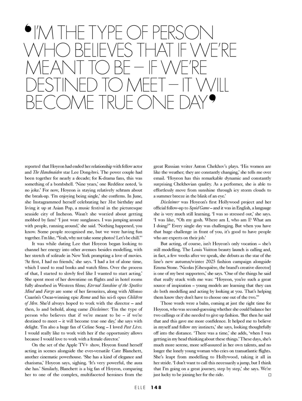 HoYeon Jung, the South Korean model and actress, commands attention in Elle UK’s November 2025 editorial. She is captured in a striking metallic jacket from Louis Vuitton, its iridescent fabric catching the light and evoking a futuristic, almost armor-like aesthetic. The jacket’s structured silhouette and oversized fur collar add a touch of drama, while the bold blue graphic eyeliner and deep red lip create a high-impact beauty moment.