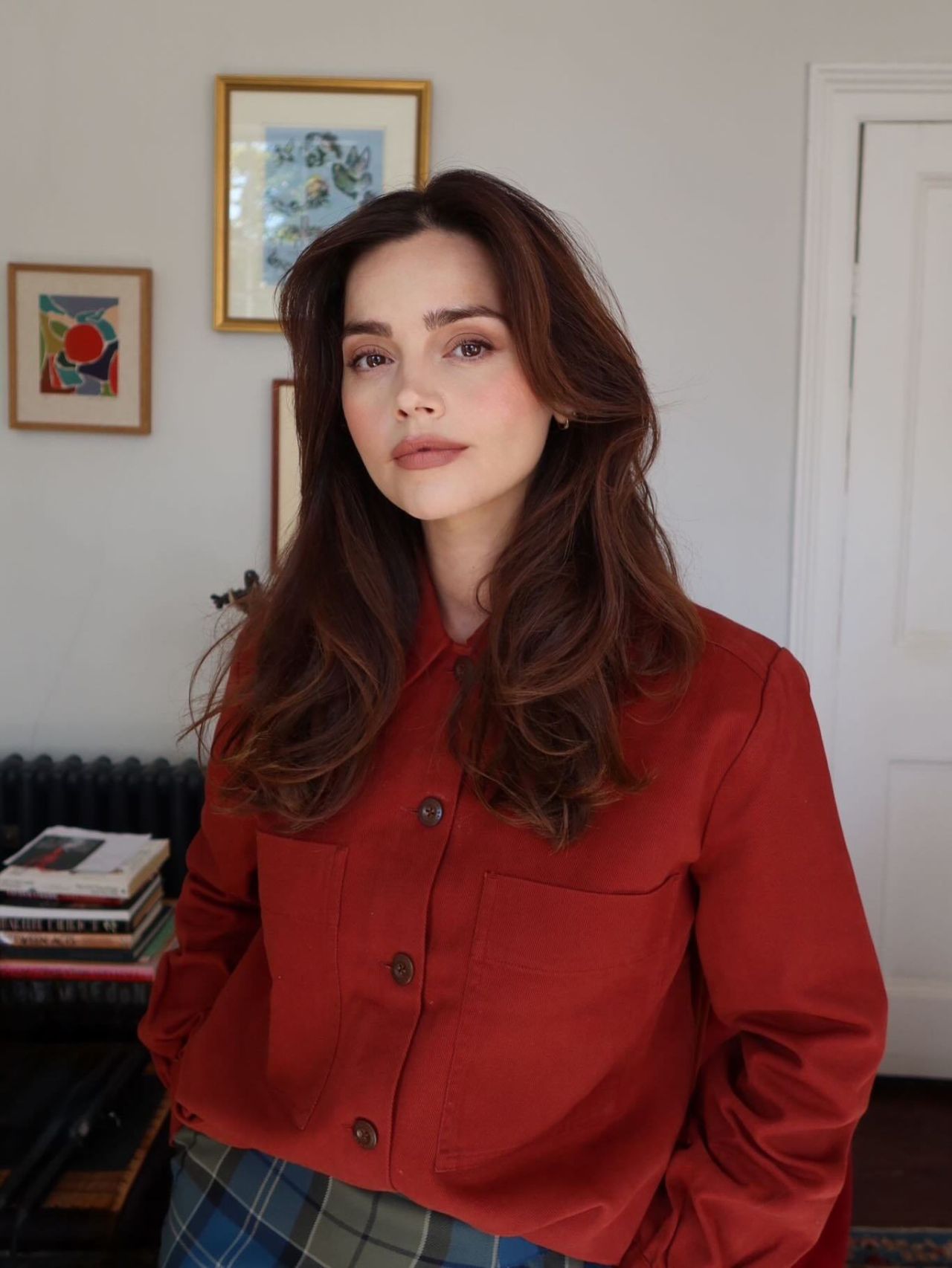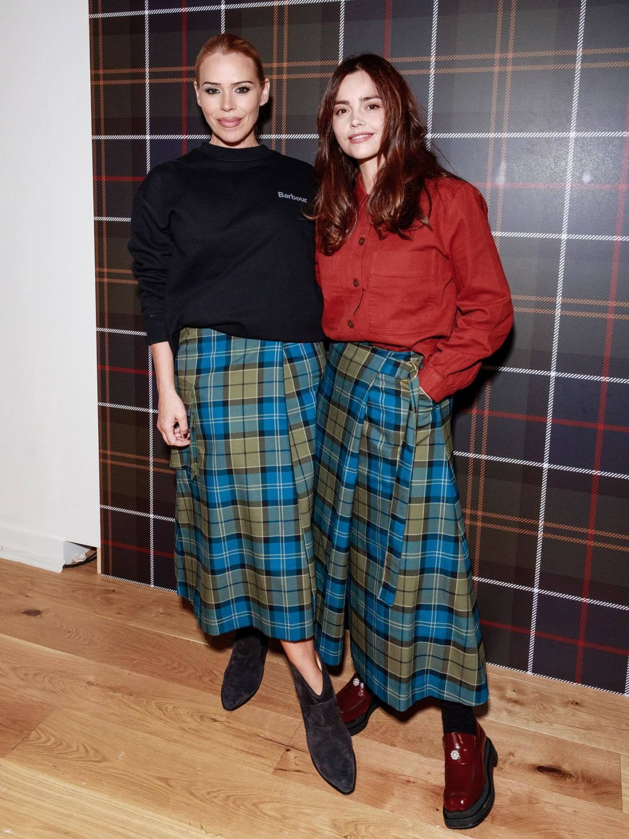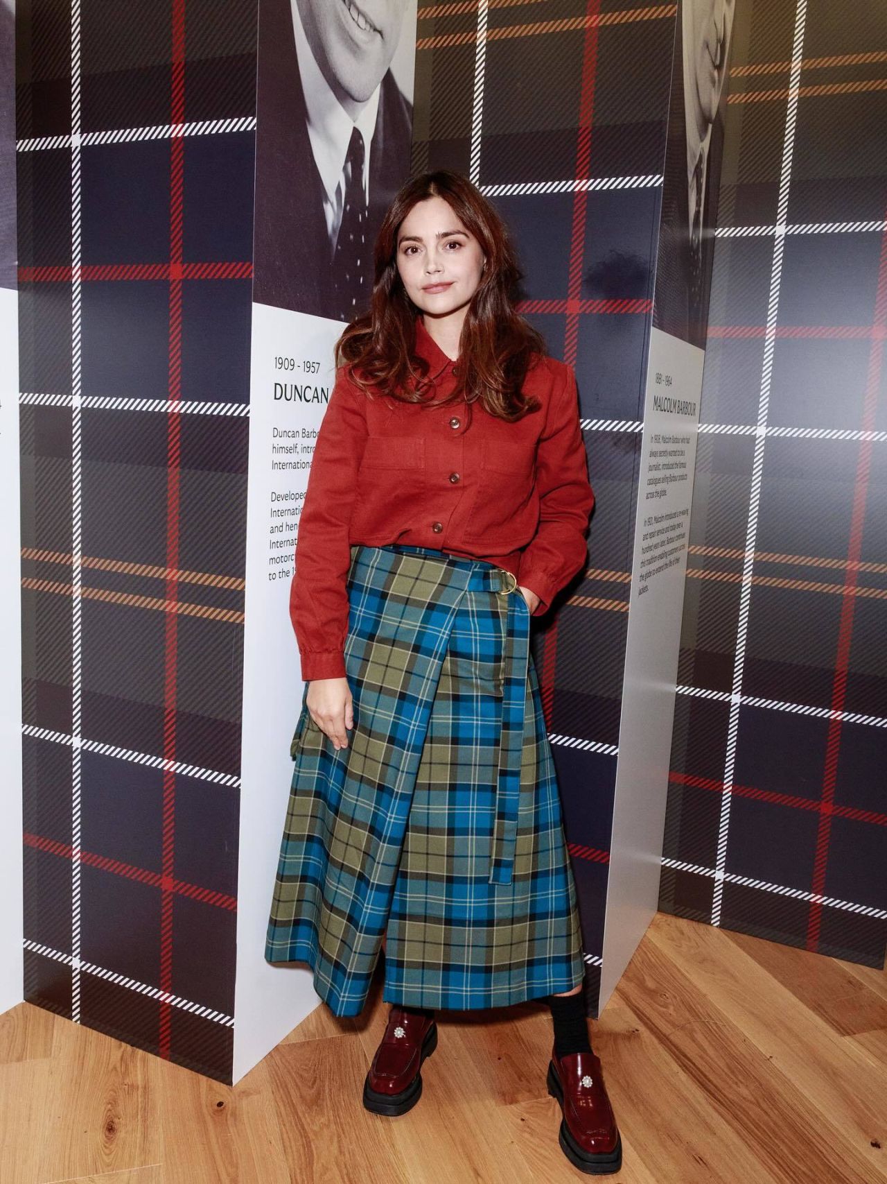 Jenna Coleman’s heritage-inspired look at the ‘Tartan: The Barbour Way’ exhibition in London on September 19, 2025, showcased a masterclass in balancing tradition and contemporary style. The actress paired a relaxed rust orange button-up shirt with a knee-length, A-line plaid skirt in blue, green, and black—a nod to the event’s tartan theme. Her choice of dark burgundy loafers with chunky soles added a modern edge, while the absence of accessories kept the focus on the textural interplay of the fabrics. The setting, featuring a mossy floral installation and a plaid backdrop, further emphasized the sartorial connection to Barbour’s iconic heritage.