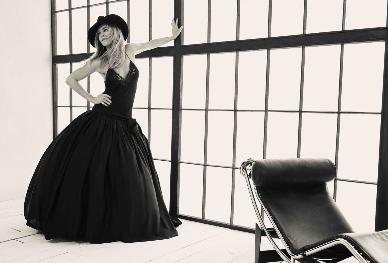 The magazine cover shot features Aniston reclining in a sheer, white lace gown that cascades dramatically over a modern red chair. The delicate texture of the lace creates a soft, ethereal contrast with the bold, structured lines of the chair and the black, long-line overcoat draped over her shoulders. The look is grounded by high-texture black heels with heavy fringe detailing visible on one lifted foot. A small gold earring is visible, maintaining a refined elegance. This is a masterful execution of sophisticated bohemia for the editorial context, available here: celebrity photos.