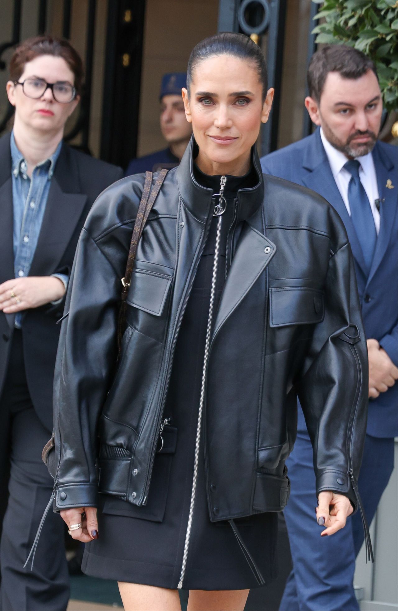The foundation of the outfit is a zip-up black mini dress, cut short to elongate the legs while remaining understated in its clean lines. She layered it beneath an oversized leather jacket with boxy shoulders and large flap pockets—proportions that play deliberately with masculine codes, softening them through fluid drape and subtle sheen.The Fabric & Texture: Matte vs. Sheen