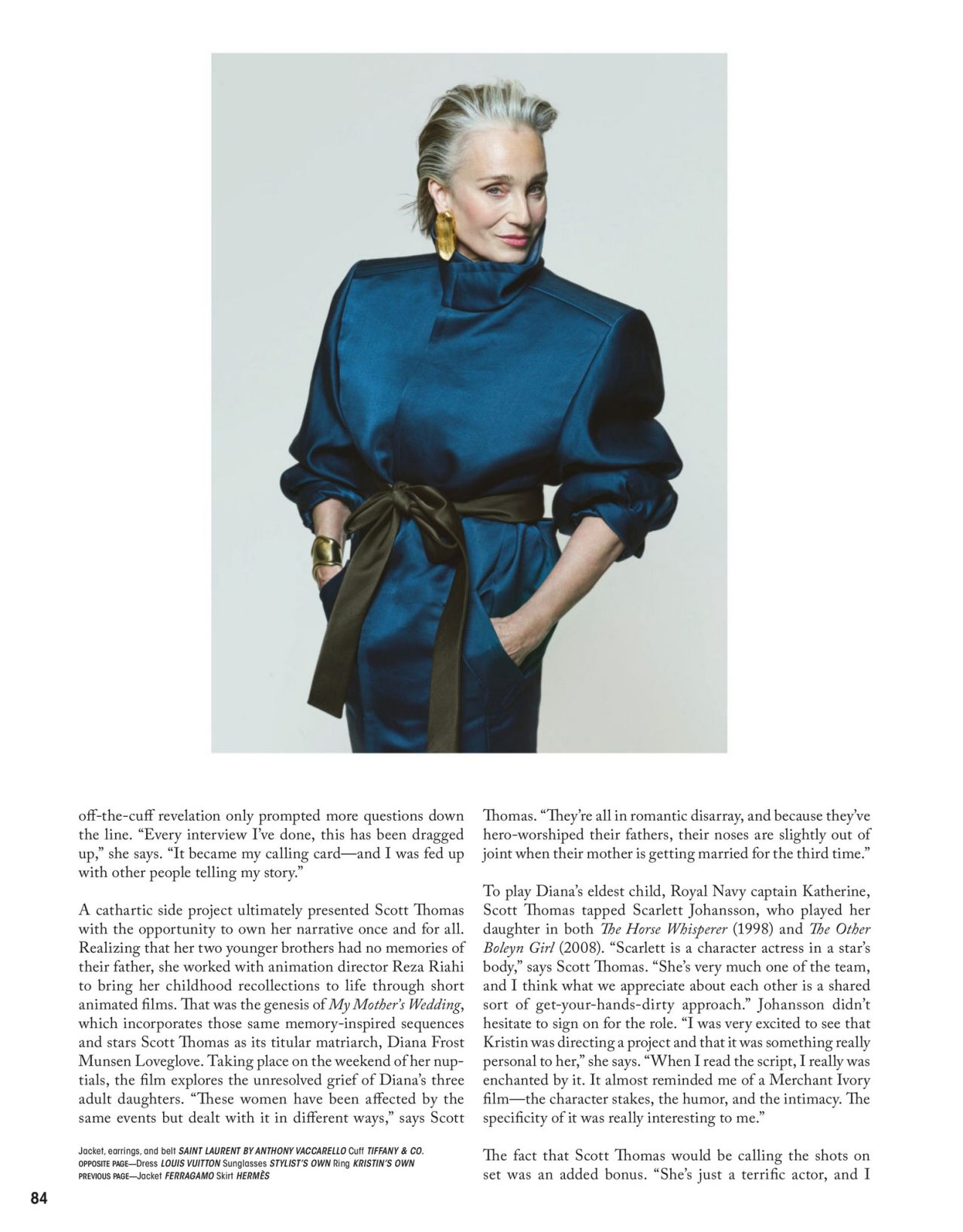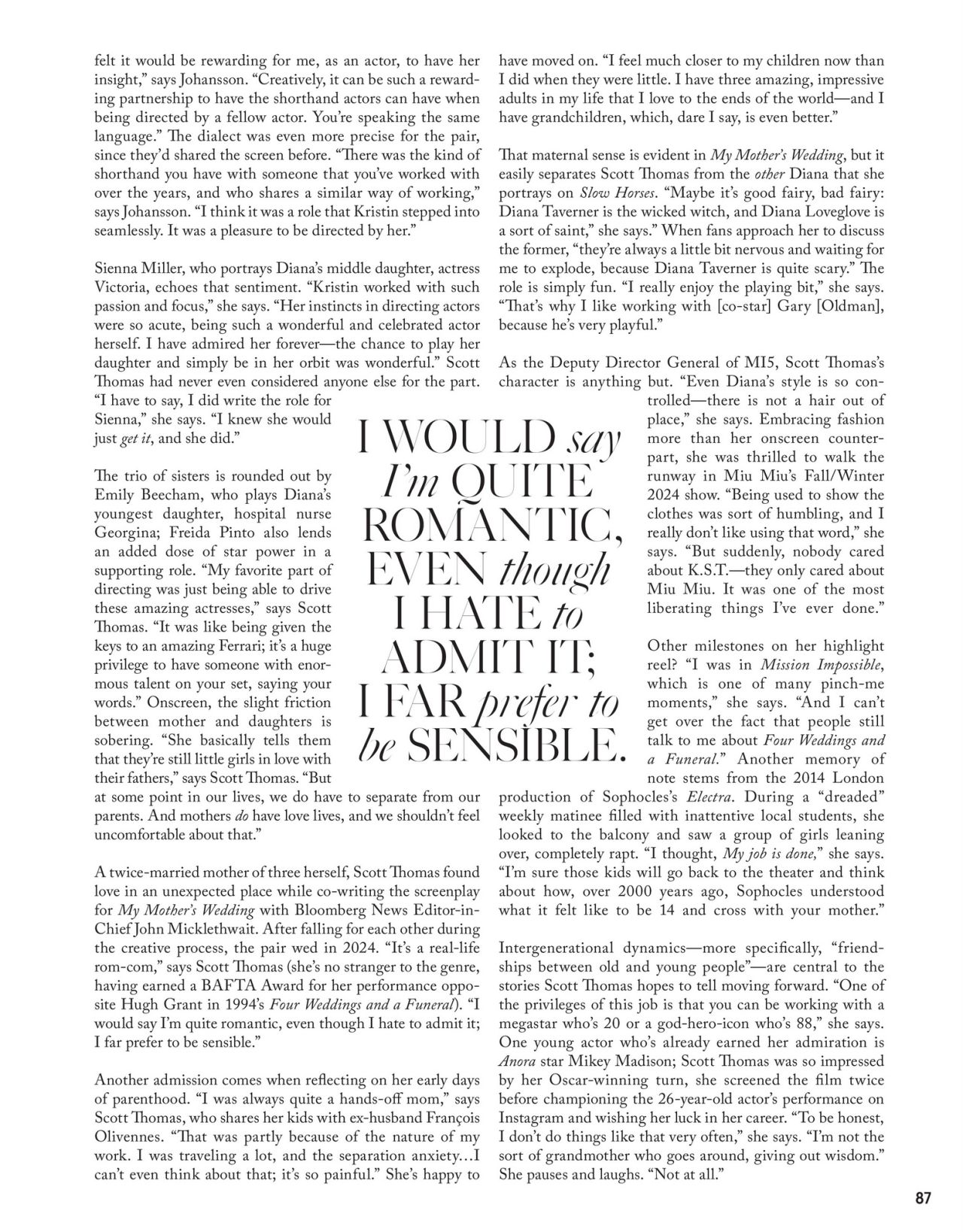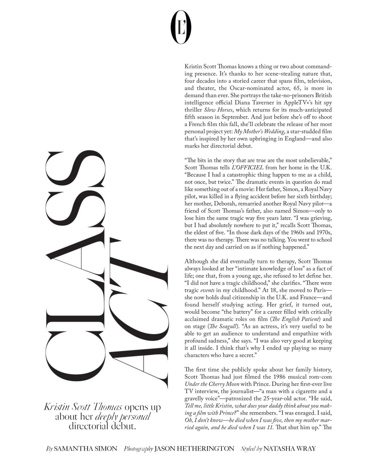 Actress Kristin Scott Thomas (https://en.wikipedia.org/wiki/Kristin_Scott_Thomas) commands the page in her September 2025 L’Officiel USA editorial, celebrating her anticipated directorial debut, My Mother’s Wedding. The photoshoot captures a profound fashion thesis: the power of restraint and precision in mature style. The feature delves into her distinguished, decades-long career, her turn as a director, and candidly addresses her views on her personal life and age, contrasting her early insecurities with a current sense of self-possession and wisdom. Her look serves as a potent visual anchor for the interview’s theme of refined confidence.