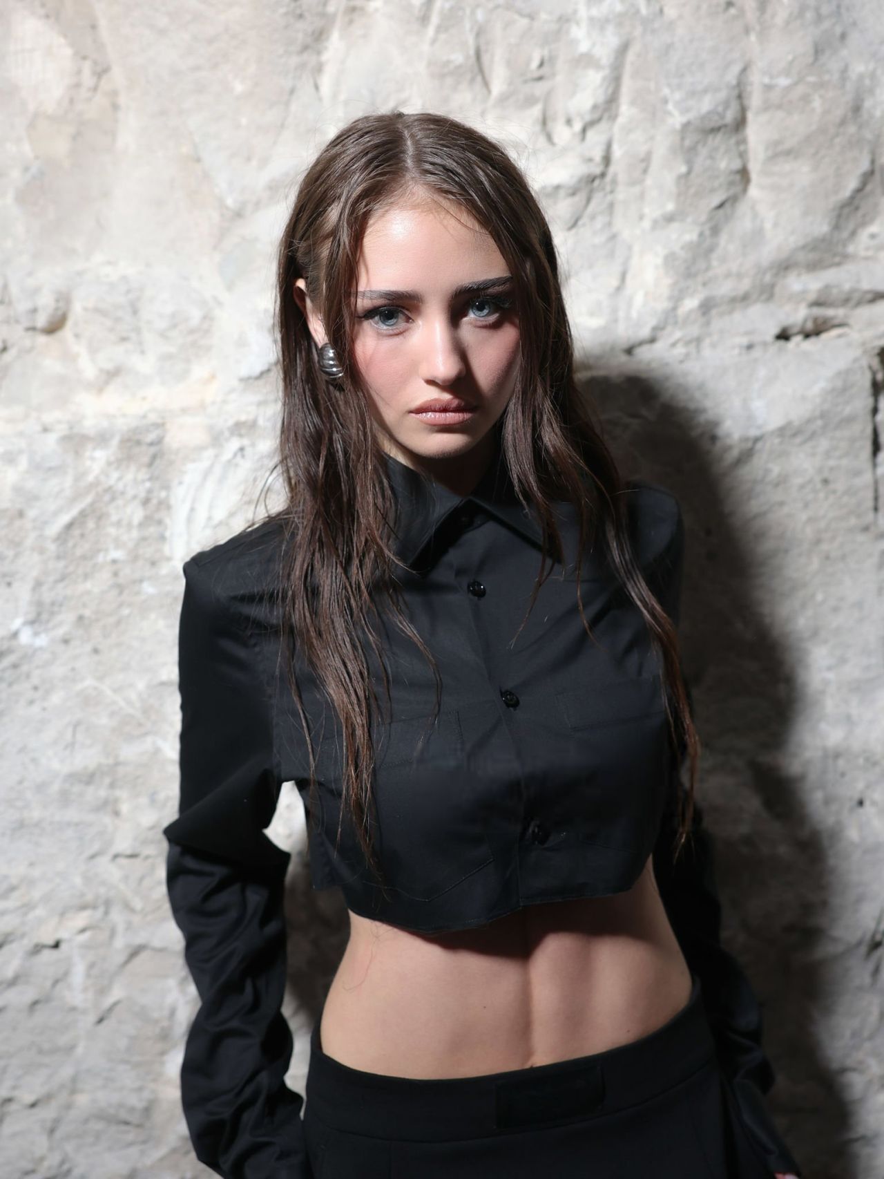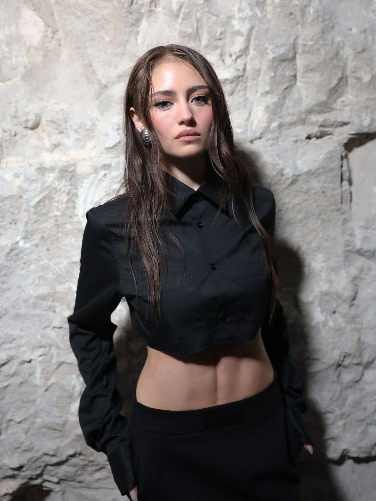 The outfit, set against a rugged stone backdrop that emphasizes its sleek lines, utilizes precise tailoring to achieve a deliberate tension between classic components and modern deconstruction. The look’s central thesis is the bold exposure of the midriff, a key trend in contemporary celebrity style that Klum executes with high-fashion intent. (Find more about Leni Klum on her Wikipedia page.)