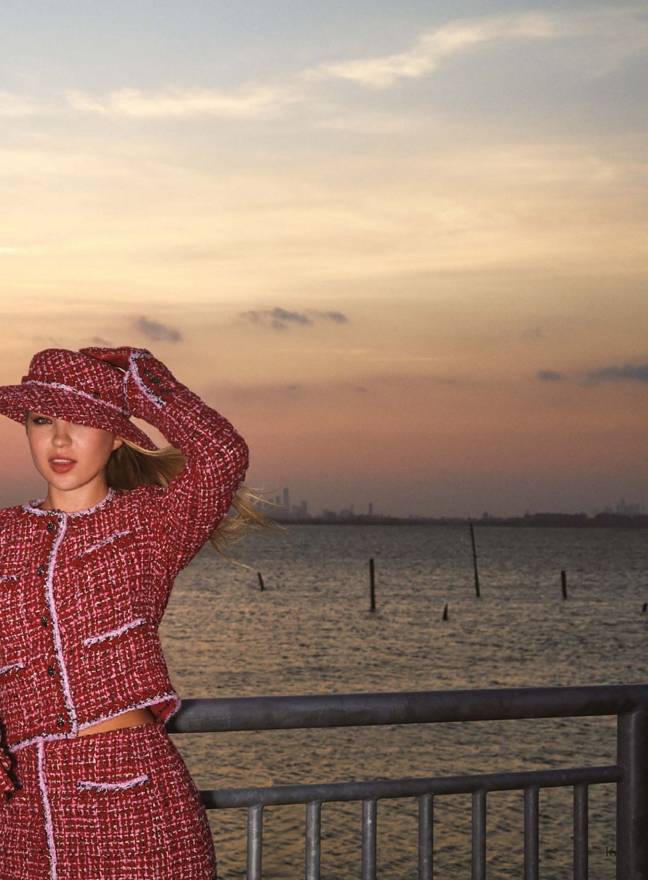 A key accessory is the matching tweed cap worn at a slight angle, giving the look a distinct, retro-chic feel reminiscent of the 1960s. Her long blonde hair flows beneath the cap, providing a softness that counters the structured tweed. The makeup is natural yet polished, focusing on a slightly matte finish and a neutral lip, allowing the vibrant colors of the garment to dominate the editorial narrative. The sunset lighting casts a warm, ethereal glow over the entire styled shoot.