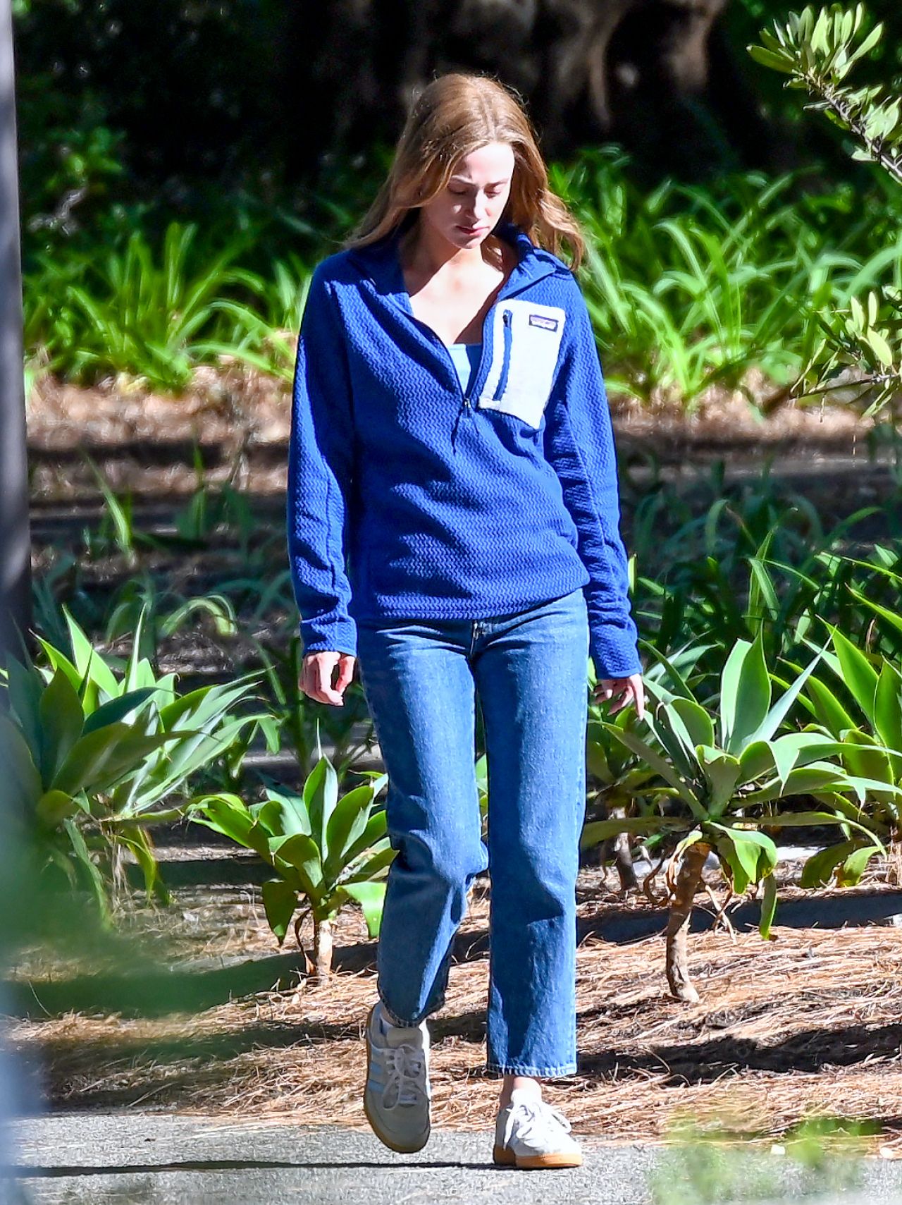The core of her look is a bright cobalt blue quarter-zip fleece pullover, which appears to be a Patagonia staple based on the white-and-blue zippered chest pocket and textured fabric. The pullover features a high collar and a relaxed, comfortable fit. She pairs this practical top with medium-wash denim jeans cut in a straight-leg, slightly cropped silhouette. The bottom hem is frayed or rolled, lending to the casual, relaxed vibe. For footwear, she wears simple grey and white athletic trainers, emphasizing comfort and utility. Her blonde hair is left loose, and the makeup is minimal, suggesting a look appropriate for a filming break or a character’s casual wardrobe.