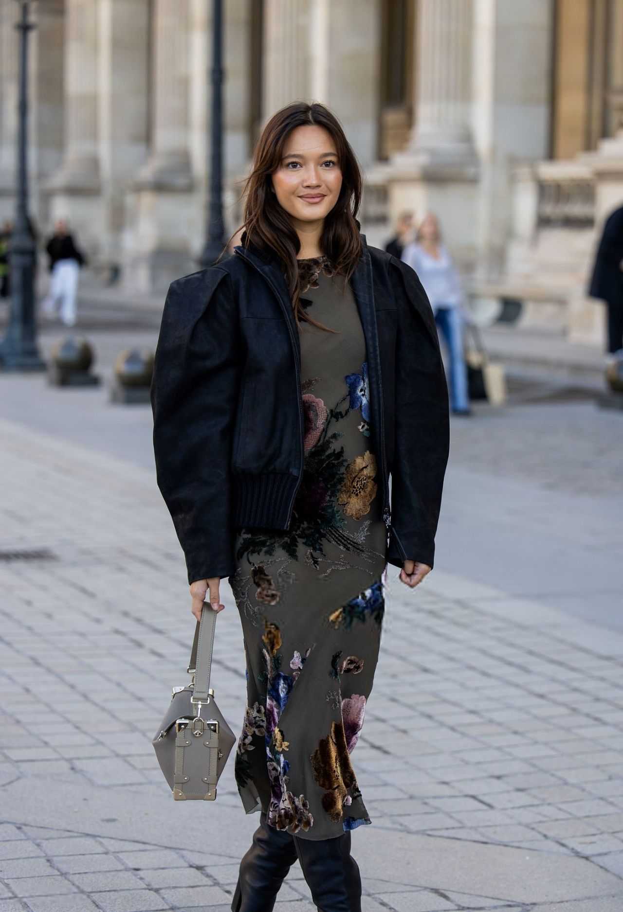 Model and social media personality Lily Chee attended the Louis Vuitton show during Paris Fashion Week on September 30, 2025, embracing a look that juxtaposed soft, romantic textures with aggressive, sculptural outerwear. Her ensemble skillfully navigates the transition between seasons, utilizing a mid-length velvet dress that exudes a dark, almost moody floral elegance, anchored by bold proportions in her jacket and accessories. The overall styling represents a sophisticated fusion of Romantic Grunge—a high-fashion take on an aesthetic popular in the early 2010s that has resurfaced in luxury front row fashion. This layered look is a perfect reference point for elevated event appearance and celebrity event look dressing. To see more fashion week looks and trending styles, explore our celebrity style section.
