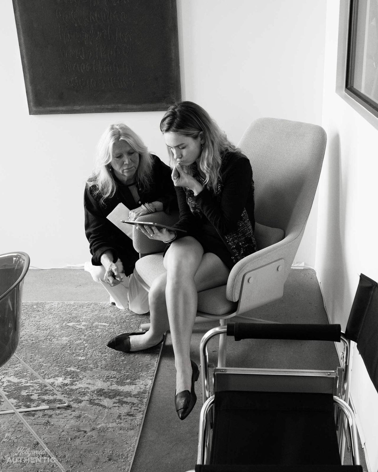 This editorial spread offers a strong example of how classic silhouettes are being repurposed for modern celebrity style. The tweed jacket, a garment historically synonymous with formality and mid-century elegance, is here subverted through styling and atmosphere. James wears it open, casually leaning back in an office chair, transforming the traditional high fashion piece into something more relaxed, suggestive of a powerful woman taking a break in her own corporate empire. This technique channels a popular photoshoot idea: the blending of personal relaxation with professional context.
