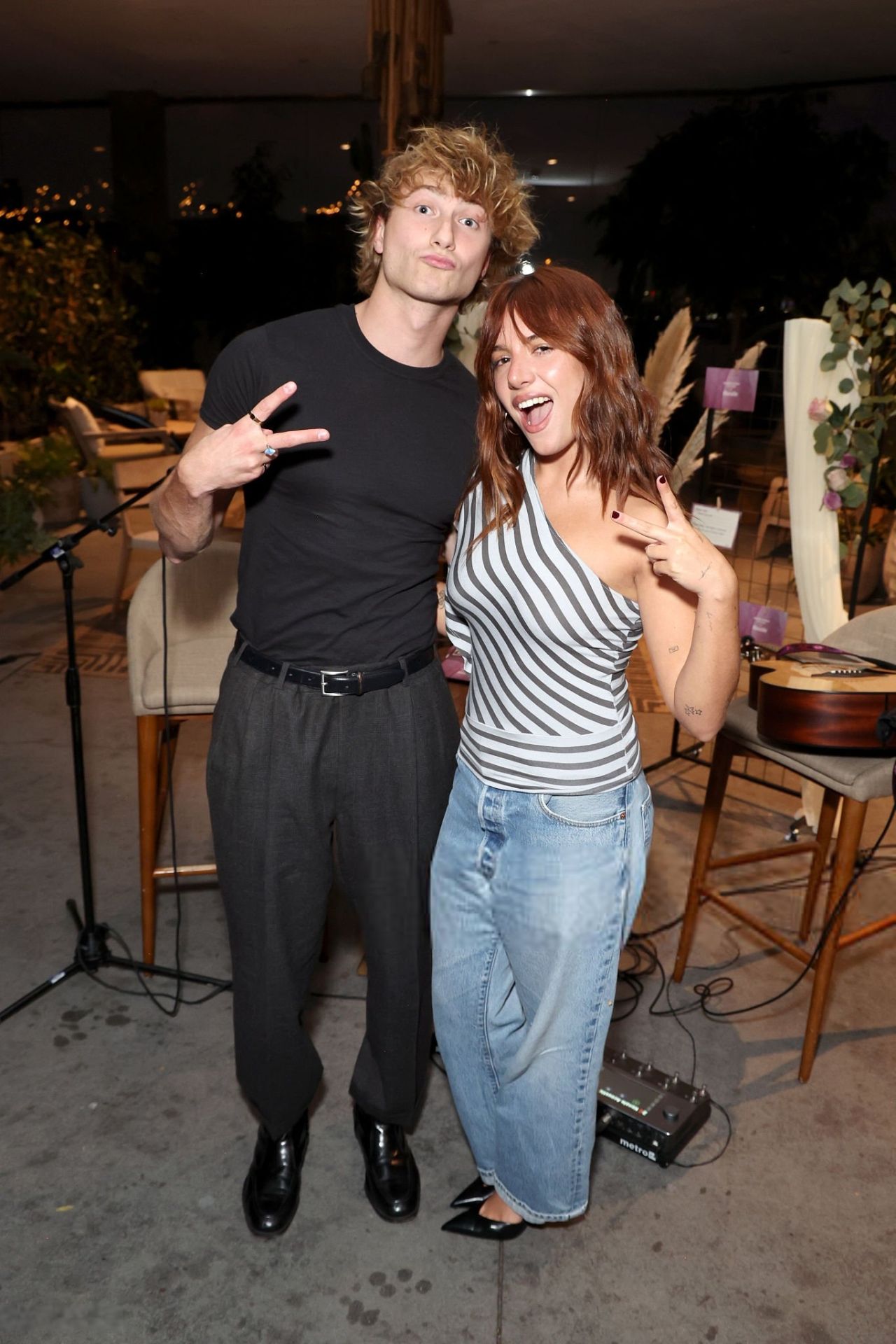 The trousers fall into the current trend of relaxed denim silhouettes, providing a modern, oversized proportion. Mackenzie, featured here among the stylish celebrity photos, completes the look with pointed black flats, subtly dressed up with silver accessories like small rings. Her companion wears an all-black top with charcoal trousers and patent leather shoes, offering a sharp, tailored counterpoint to her casual proportions. This ensemble is well-suited for a performance and casual evening event setting, combining comfort and deliberate styling.