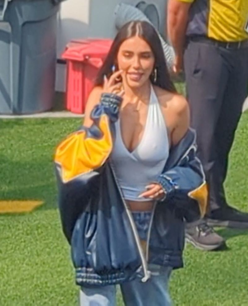 The look is a polished take on game-day casual. Beer wears a white, slightly sheer halter-neck top with thin horizontal stripes that shows off her shoulders and neckline. The top is paired with what appears to be light-wash denim jeans. For a sporty layer, she drapes a navy blue bomber jacket—featuring wide yellow contrast cuffs and collar—over her shoulders, adding a collegiate, athletic touch. Large gold hoop earrings serve as the primary accessory, adding a touch of glamour that contrasts the laid-back nature of the rest of the outfit. Her long, dark hair is styled sleekly with a defined center part.