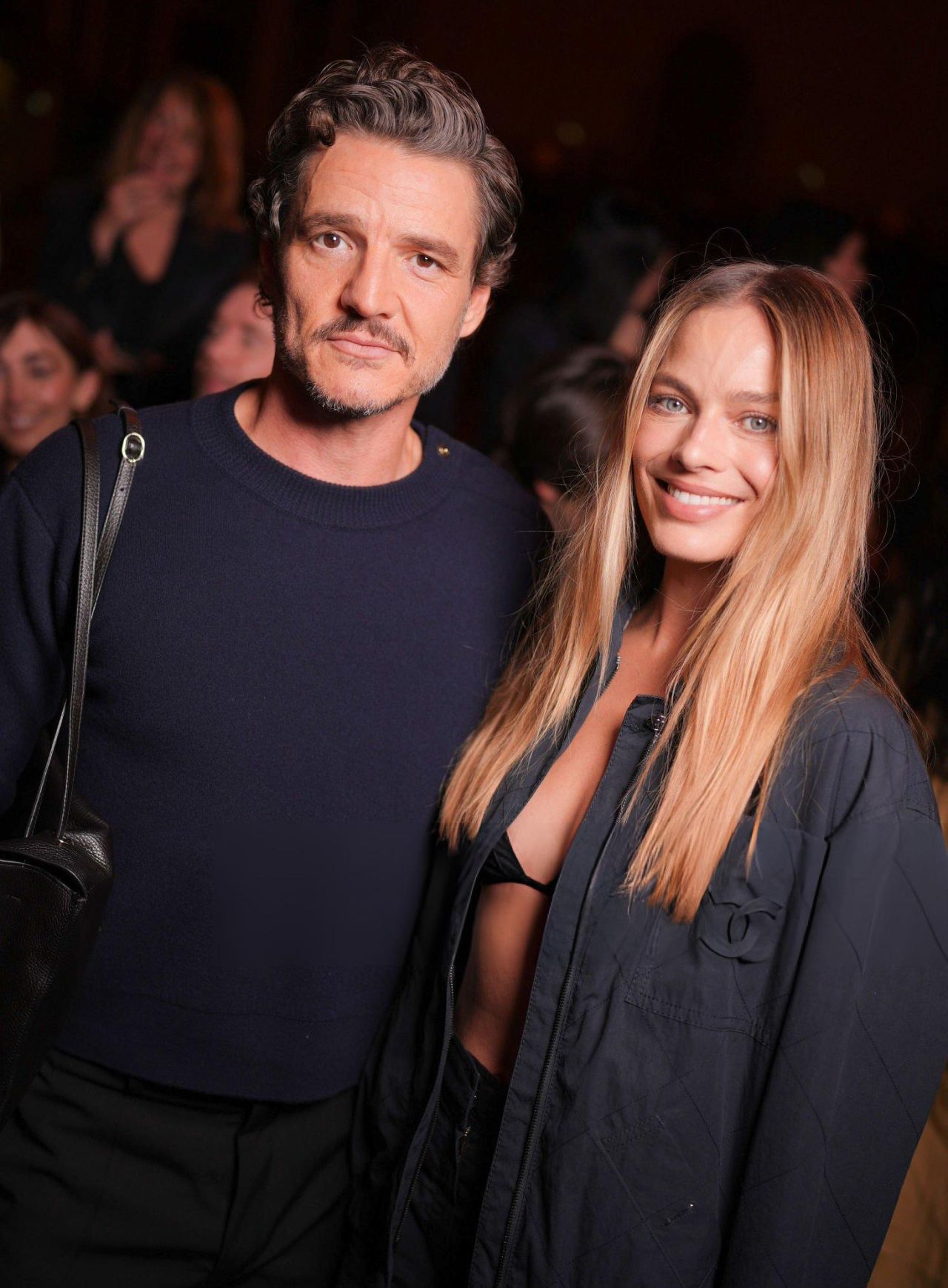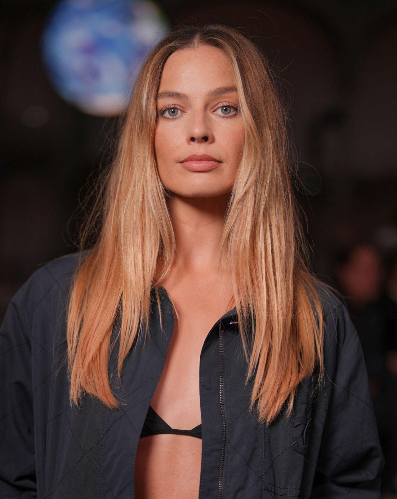 The styling maintains a polished minimalism. Robbie’s accessories include a small, curved shoulder bag (per the context, a blue leather mini bag) and a prominent Chanel Coco Crush Ring on her index finger, which integrates the brand’s classic quilting pattern into her jewelry. Her hair is styled sleek and straight, with a central part, and her makeup is kept natural, allowing the strength of the outfit’s silhouette to command attention. This selection perfectly showcases her evolving, moving between dramatic film premiere looks and this chic, pared-down fashion week approach.