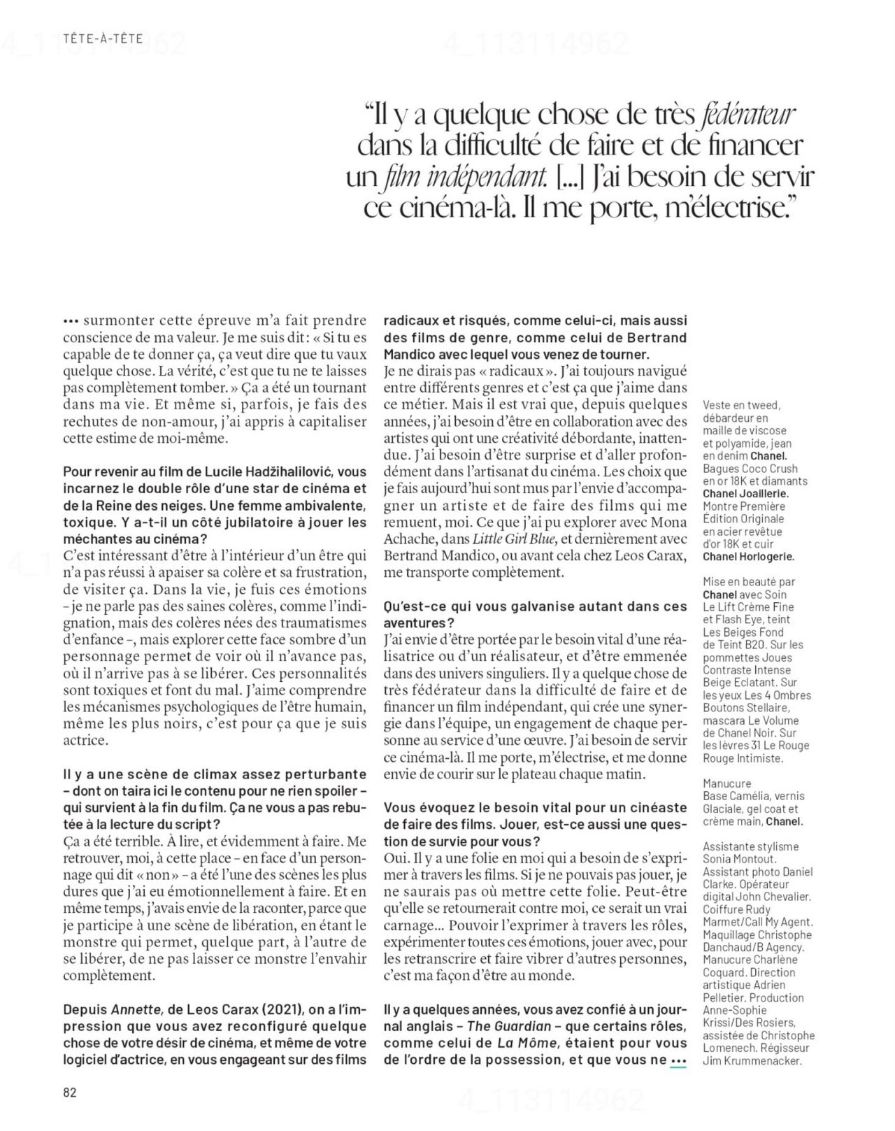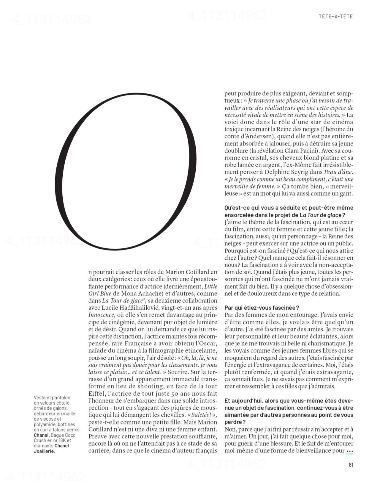 The central element of the look is the contrast between textures and volumes. Cotillard pairs a sleek, structured black leather bomber jacket—reportedly Chanel—with a casual white ribbed tank top, creating an immediate dialogue between hard and soft. The jacket features subtle ruched shoulder detailing and button closures, elevating it beyond a standard biker jacket. Below the waist, she embraces the dominant wide-leg denim trend. The jeans are a soft, light-to-medium wash, providing volume and a relaxed drape that contrasts sharply with the cropped jacket. This strategic use of proportion and fabric defines the modern fashion spread aesthetic. Accessories are kept minimal yet precise, with several delicate rings and a link bracelet—confirmed as Chanel Joaillerie in the image’s accompanying text—lending a quiet luxury finish to the overall ensemble.