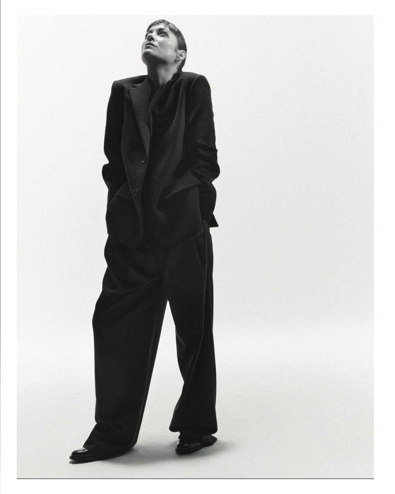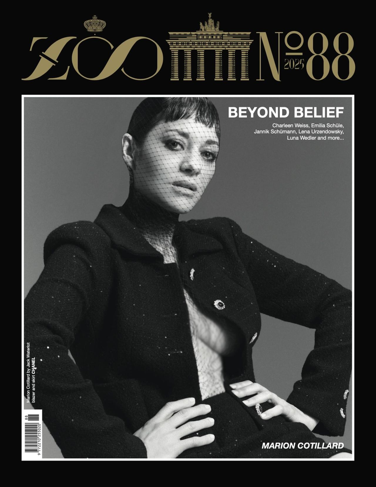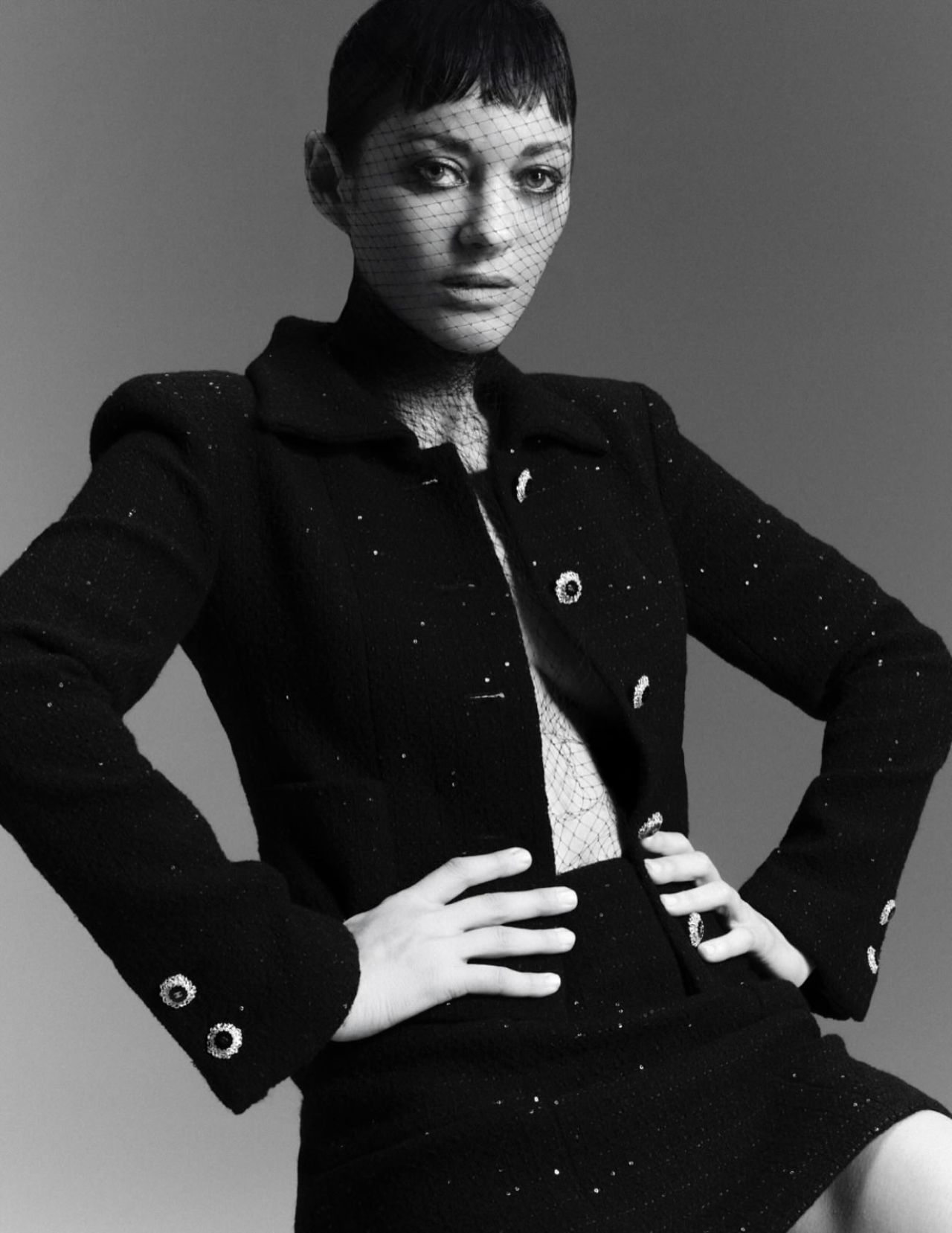 Marion Cotillard delivers a hauntingly elegant fashion moment in ZOO Magazine’s Issue #88. The editorial spread captures Cotillard in a structured black blazer, its sharp tailoring and embellished cuffs exuding authority and refinement. The blazer is layered over a sheer tulle veil, adding an ethereal contrast to the ensemble’s structured lines. Paired with high-waisted black trousers and knee-high leather boots, the look strikes a balance between masculine tailoring and feminine mystery.