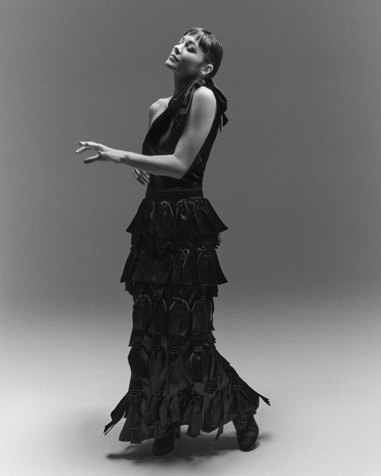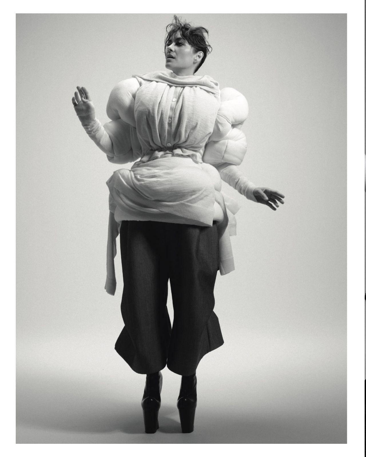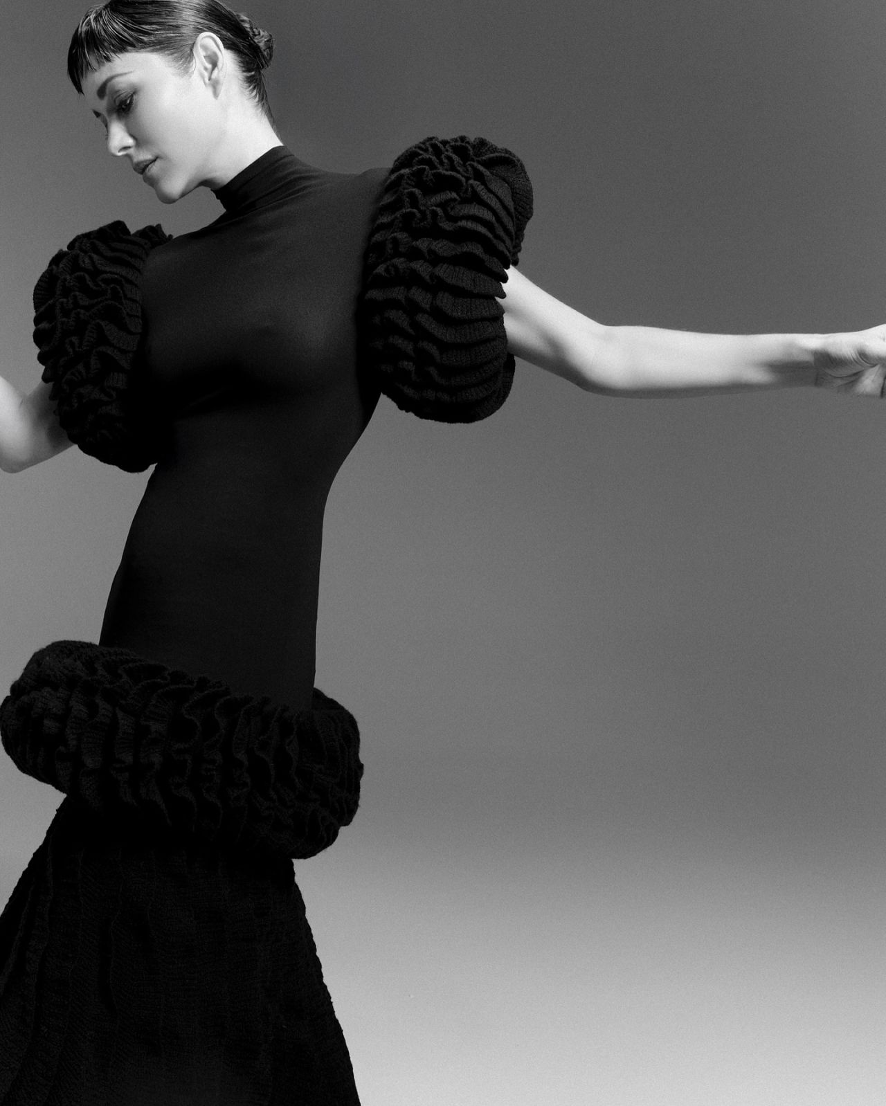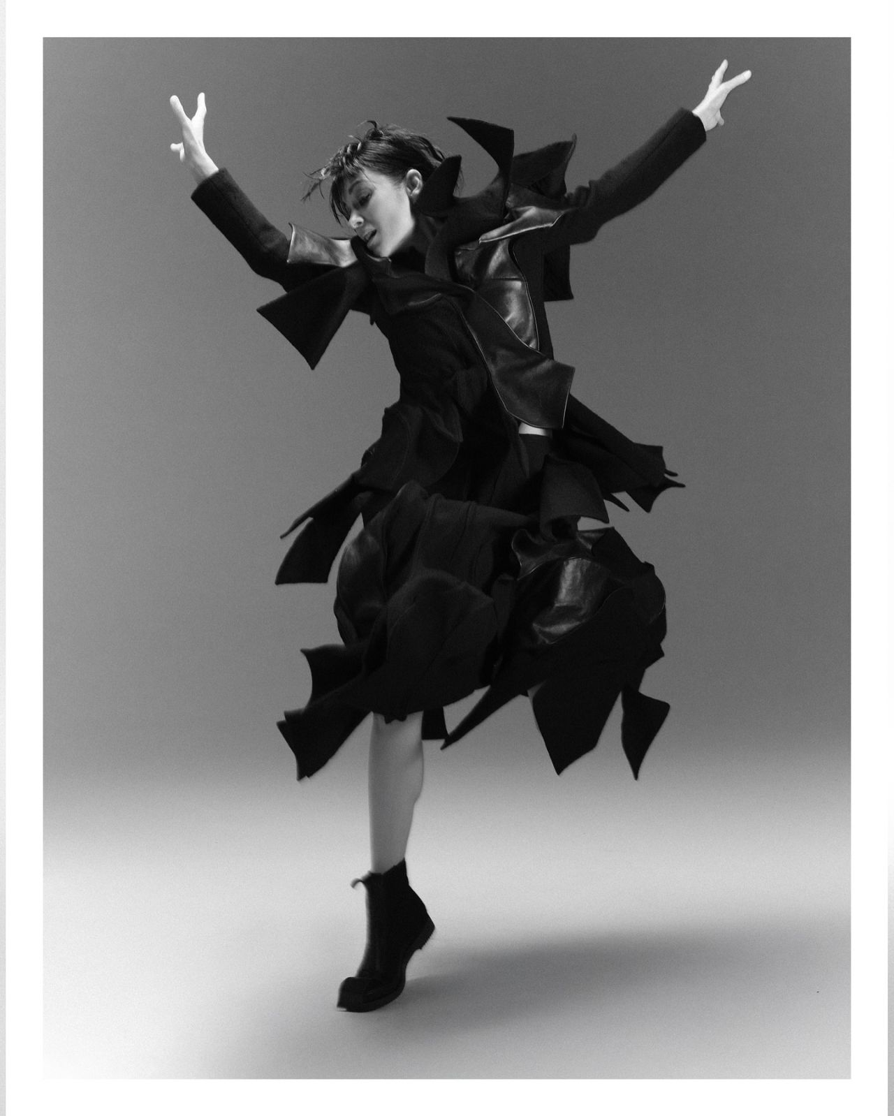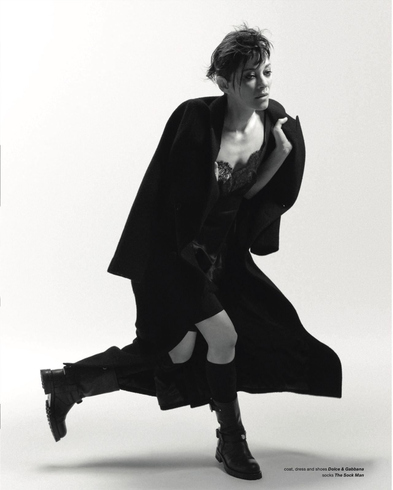 Cotillard’s short, textured hair and minimal makeup enhance the editorial’s moody aesthetic, while the monochromatic palette ensures the focus remains on the interplay of textures and silhouettes.