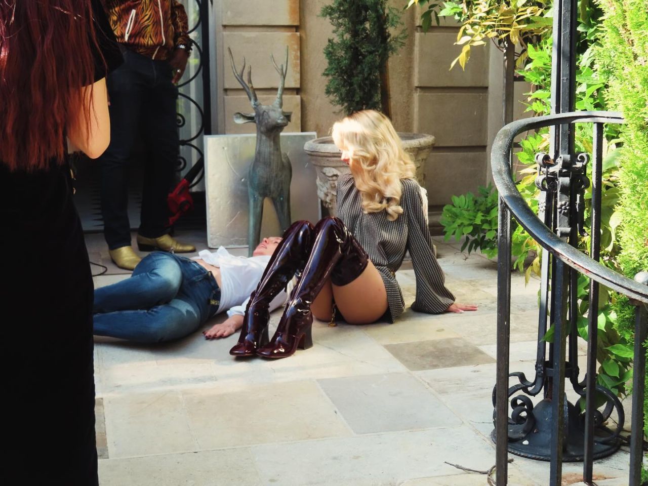 Key details underscore the glamorous grunge aesthetic. The visible, structured harness straps of the bra serve as a deliberate style detail, moving the garment from underwear to outerwear. The combat boots—with visible lacing or buckle hardware—provide necessary visual weight to ground the abbreviated hemline and prevent the outfit from feeling too exposed. The jewelry is minimal, focusing on the large, ornate belt buckle, while her makeup is natural yet defined, suitable for a striking editorial image.