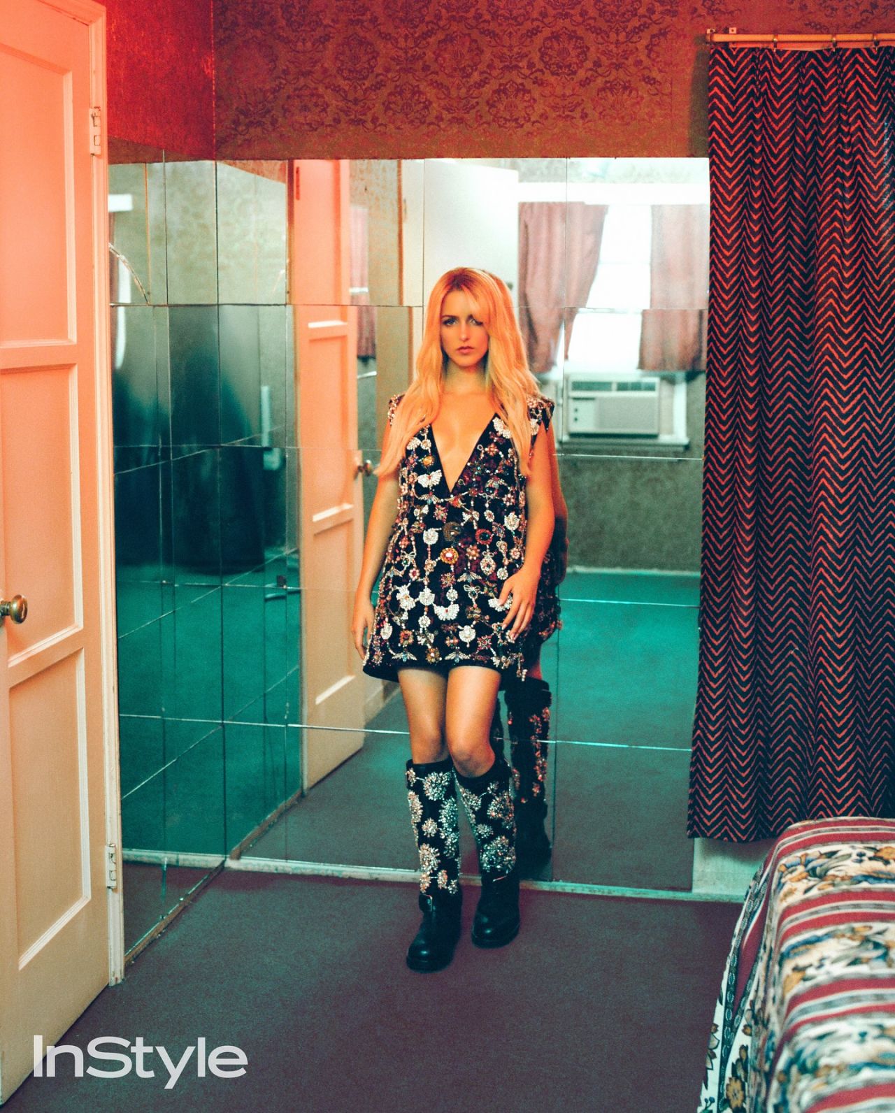 For her editorial spread in Instyle Mexico’s October 2025 issue, actor Mckenna Grace channels a potent blend of vintage rock glamour and exposed-foundation styling. This photoshoot look is a powerful departure from her typical roles, presenting a confident, edgy persona perfect for a fashion spread aiming at a youthful, trend-aware audience. The ensemble is defined by dark, tactile textures and a sharp interplay of revealing and covering pieces, making it a strong example of modern high fashion editorial work.
